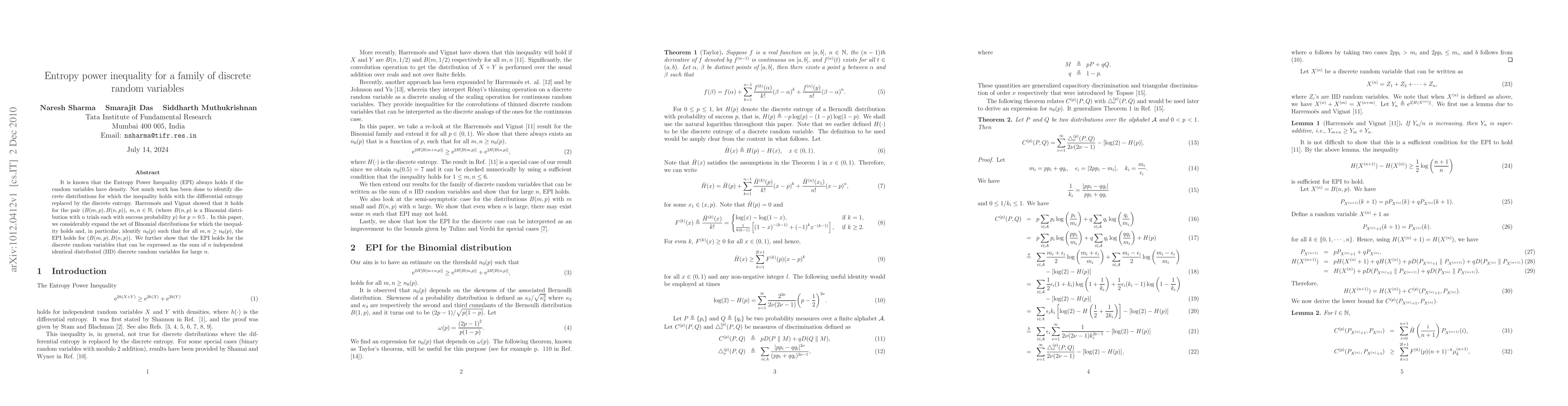 This paper extends the Entropy Power Inequality (EPI) to a broader set of Binomial distributions, identifying a threshold n_0(p) for which the inequality holds for large m and n. It also demonstrates the EPI for sums of large numbers of independent identically distributed discrete random variables.