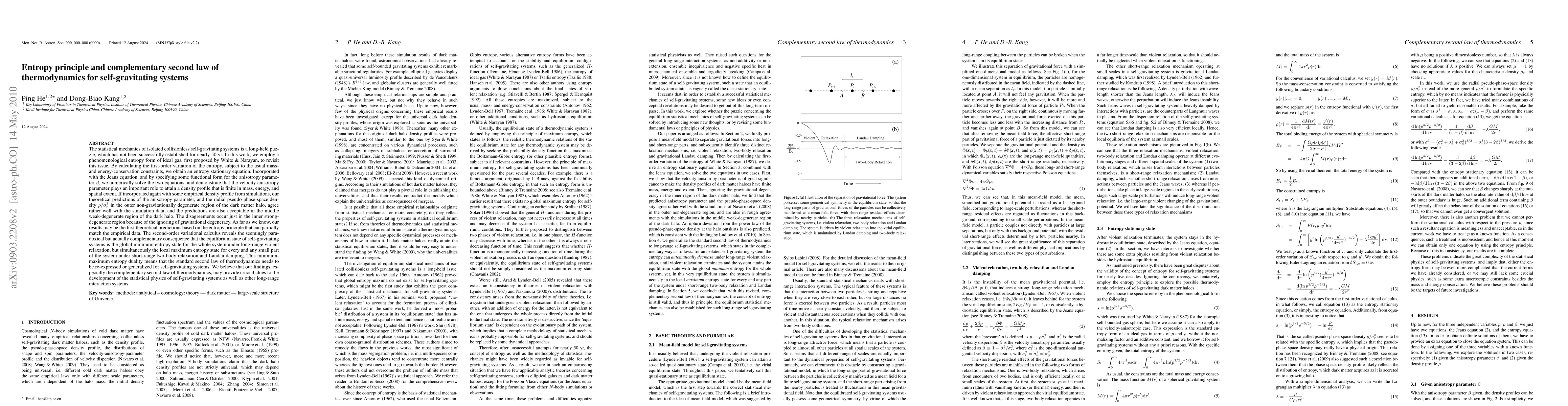 This paper revisits the statistical mechanics of self-gravitating systems using a phenomenological entropy form, demonstrating that the velocity anisotropy parameter is crucial for finite density profiles. It proposes a complementary second law of thermodynamics for these systems, revealing a minimum-maximum entropy duality that challenges traditional thermodynamic interpretations.