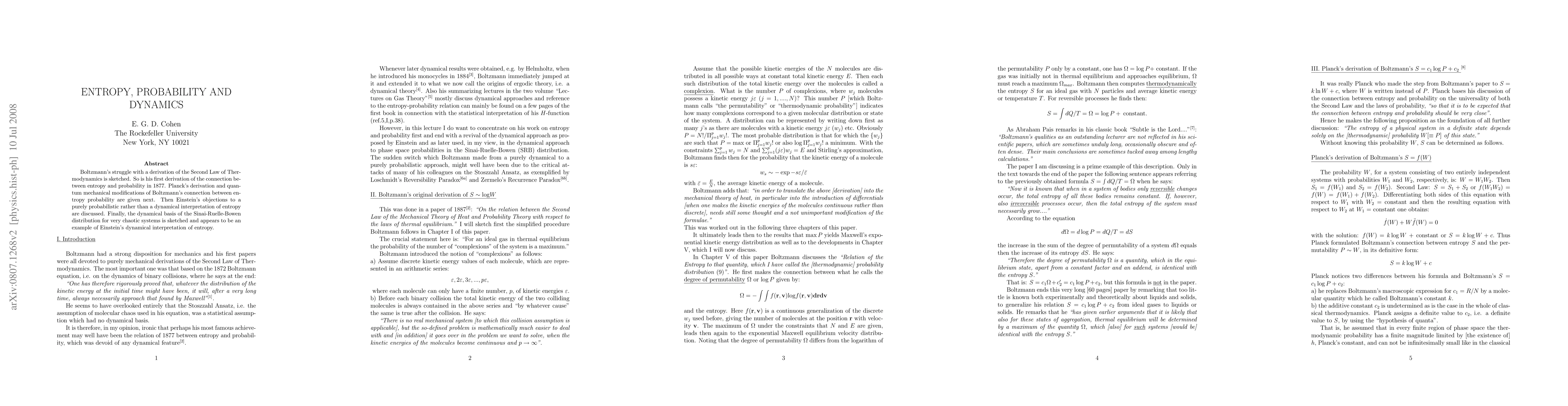 Boltzmann's struggle with a derivation of the Second Law of Thermodynamics is sketched. So is his first derivation of the connection between entropy and probability in 1877. Planck's derivation and quantum mechanical modifications of Boltzmann's connection between entropy probability are given next. Then Einstein's objections to a purely probabilistic rather than a dynamical interpretation of entropy are discussed. Finally, the dynamical basis of the Sinai-Ruelle-Bowen distribution for very chaotic systems is sketched and appears to be an example of Einstein's dynamical interpretation of entropy.