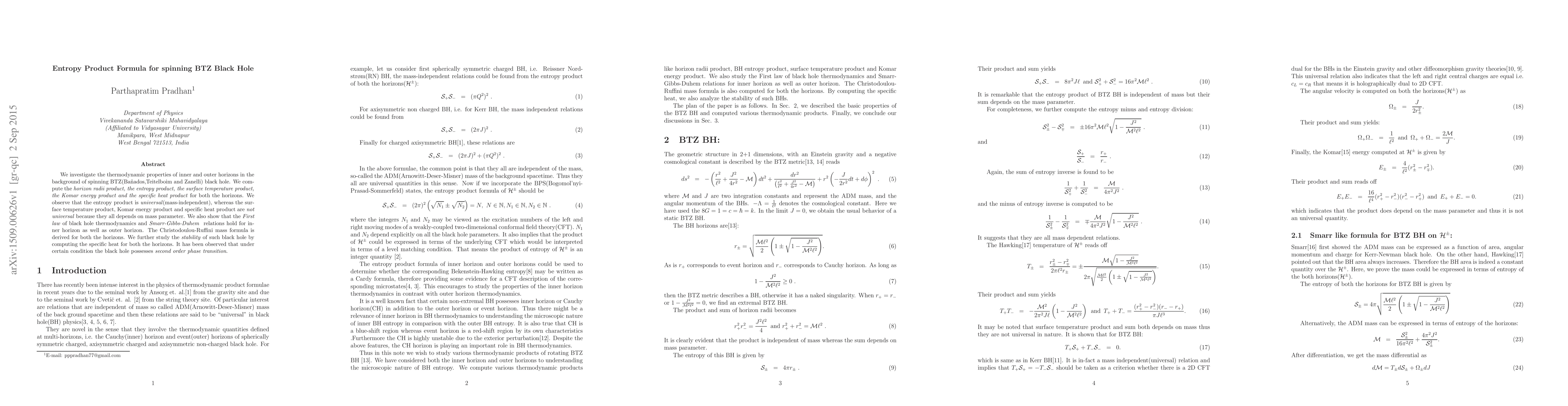 This paper explores the thermodynamic properties of spinning BTZ black holes, finding a universal entropy product independent of mass, while surface temperature, Komar energy, and specific heat products depend on the mass parameter. The study verifies the First law and Smarr-Gibbs-Duhem relations for both horizons, deriving the Christodoulou-Ruffini mass formula and noting the possibility of a second-order phase transition under specific conditions.