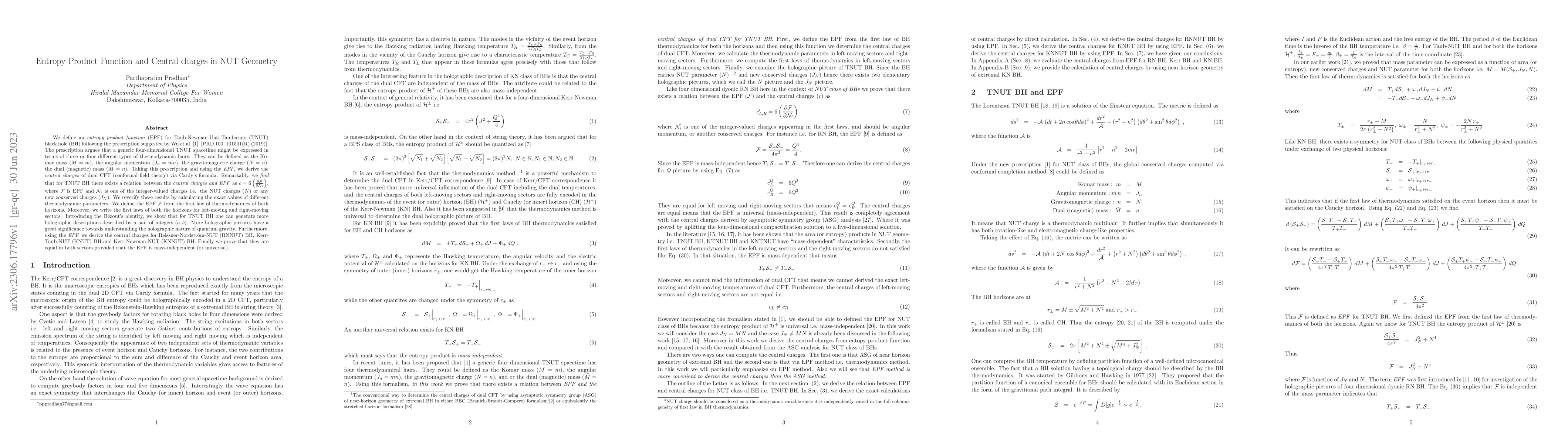 This paper defines an entropy product function (EPF) for Taub-Newman-Unti-Tamburino (TNUT) black holes and derives central charges of dual conformal field theories using Cardy's formula. It finds a relation between central charges and EPF, showing that more holographic descriptions can be generated for TNUT black holes.