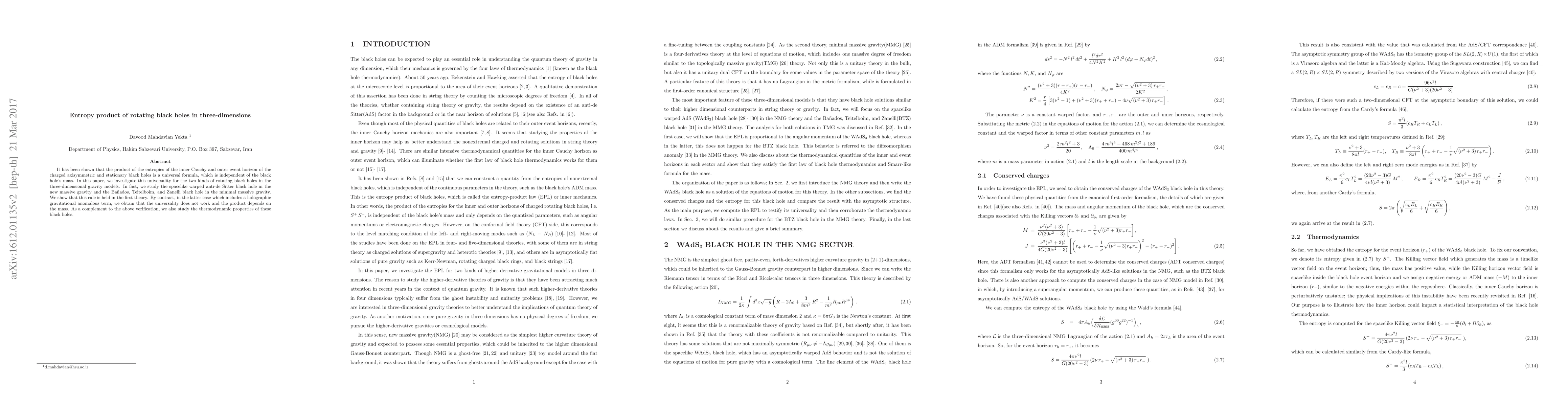 It has been shown that the product of the entropies of the inner Cauchy and outer event horizon of the charged axisymmetric and stationary black holes is a universal formula, which is independent of the black hole's mass. In this paper, we investigate this universality for the two kinds of rotating black holes in the three-dimensional gravity models. In fact, we study the spacelike warped anti-de Sitter black hole in the new massive gravity and the Ba~nados, Teitelboim, and Zanelli black hole in the minimal massive gravity. We show that this rule is held in the first theory. By contrast, in the latter case which includes a holographic gravitational anomalous term, we obtain that the universality does not work and the product depends on the mass. As a complement to the above verification, we also study the thermodynamic properties of these black holes.