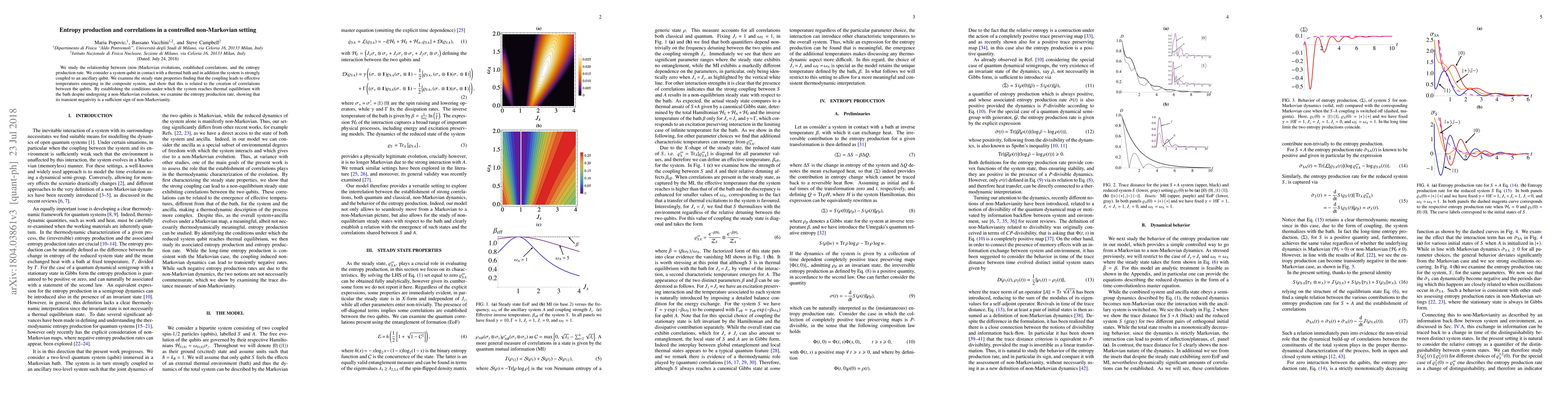 We study the relationship between (non-)Markovian evolutions, established correlations, and the entropy production rate. We consider a system qubit in contact with a thermal bath and in addition the system is strongly coupled to an ancillary qubit. We examine the steady state properties finding that the coupling leads to effective temperatures emerging in the composite system, and show that this is related to the creation of correlations between the qubits. By establishing the conditions under which the system reaches thermal equilibrium with the bath despite undergoing a non-Markovian evolution, we examine the entropy production rate, showing that its transient negativity is a sufficient sign of non-Markovianity.
