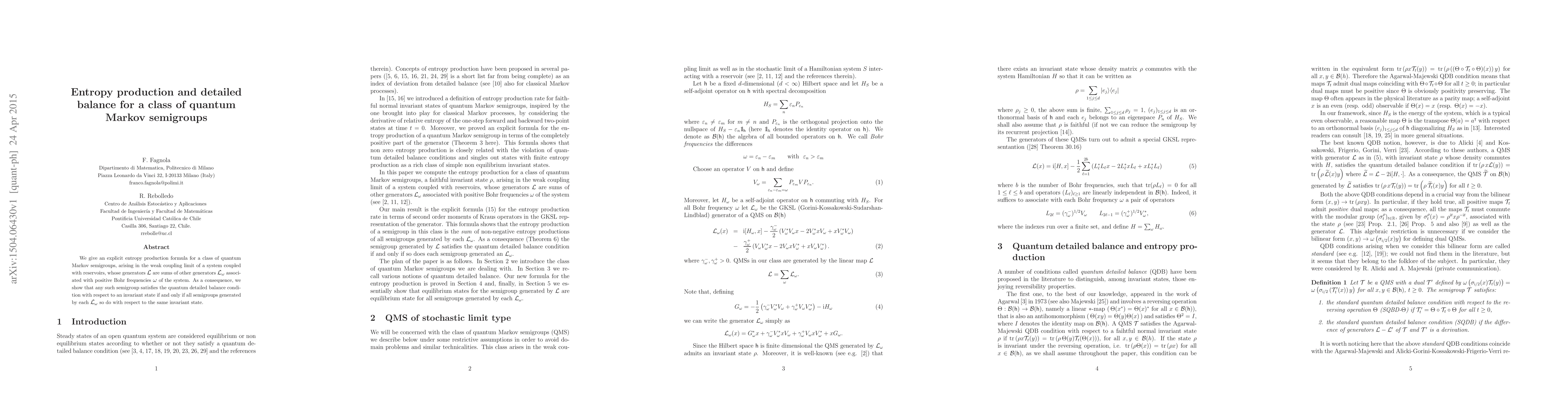 We give an explicit entropy production formula for a class of quantum Markov semigroups, arising in the weak coupling limit of a system coupled with reservoirs, whose generators $\mathcal{L}$ are sums of other generators $\mathcal{L}_\omega$ associated with positive Bohr frequencies $\omega$ of the system. As a consequence, we show that any such semigroup satisfies the quantum detailed balance condition with respect to an invariant state if and only if all semigroups generated by each $\mathcal{L}_\omega$ so do with respect to the same invariant state.