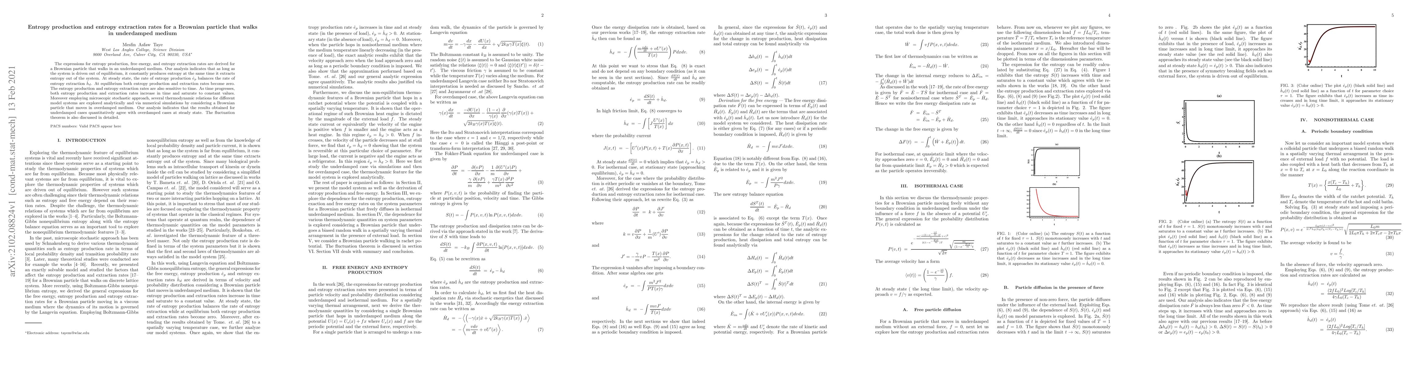 The expressions for entropy production, free energy, and entropy extraction rates are derived for a Brownian particle that walks in an underdamped medium. Our analysis indicates that as long as the system is driven out of equilibrium, it constantly produces entropy at the same time it extracts entropy out of the system. At steady state, the rate of entropy production ${\dot e}_{p}$ balances the rate of entropy extraction ${\dot h}_{d}$. At equilibrium both entropy production and extraction rates become zero. The entropy production and entropy extraction rates are also sensitive to time. As time progresses, both entropy production and extraction rates increase in time and saturate to constant values. Moreover employing microscopic stochastic approach, several thermodynamic relations for different model systems are explored analytically and via numerical simulations by considering a Brownian particle that moves in overdamped medium. Our analysis indicates that the results obtained for underdamped cases quantitatively agree with overdamped cases at steady state. The fluctuation theorem is also discussed in detailed.