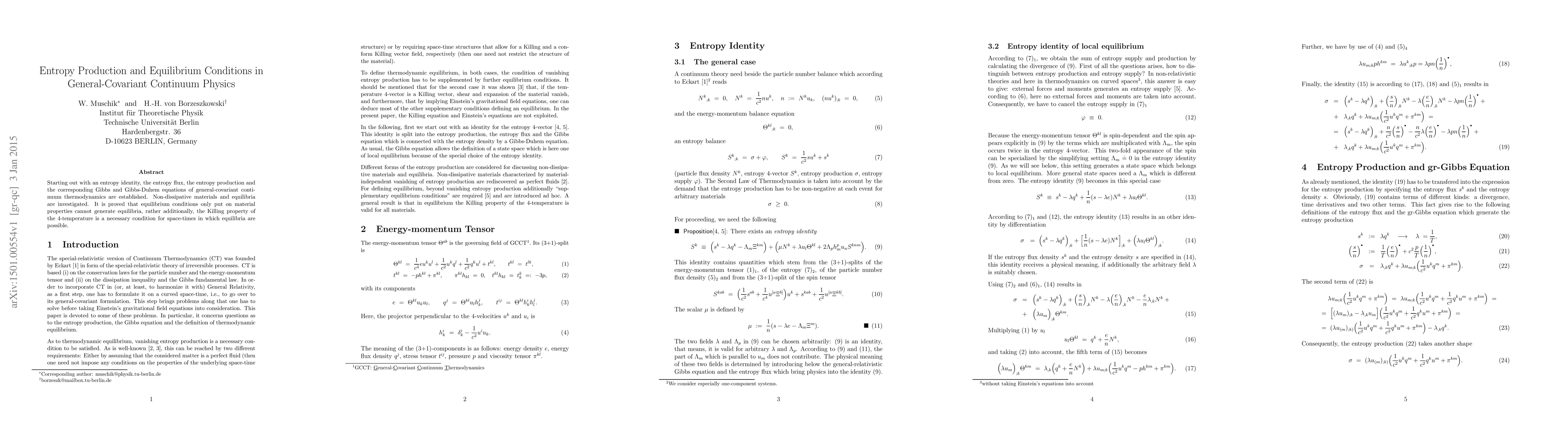 Starting out with an entropy identity, the entropy flux, the entropy production and the corresponding Gibbs and Gibbs-Duhem equations of general-covariant conti\-nuum thermodynamics are established. Non-dissipative materials and equilibria are investigated. It is proved that equilibrium conditions only put on material properties cannot generate equilibria, rather additionally, the Killing property of the 4-temperature is a necessary condition for space-times in which equilibria are possible.