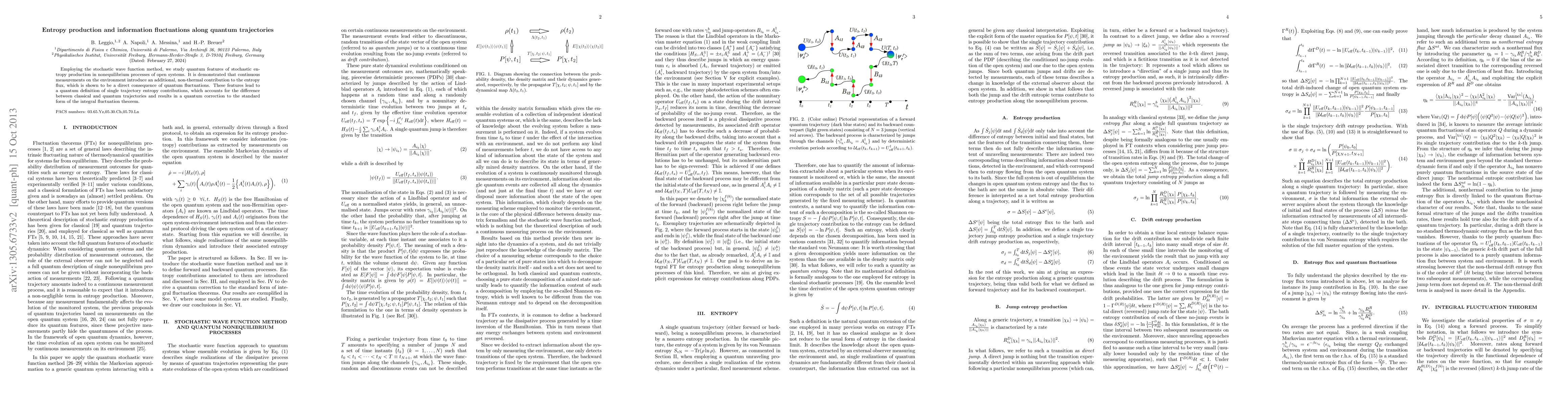 This paper investigates quantum features of entropy production in open systems using the stochastic wave function method, revealing that continuous environmental measurements introduce a non-thermal entropy flux due to quantum fluctuations. It proposes a quantum definition of single trajectory entropy, leading to a correction in the integral fluctuation theorem.