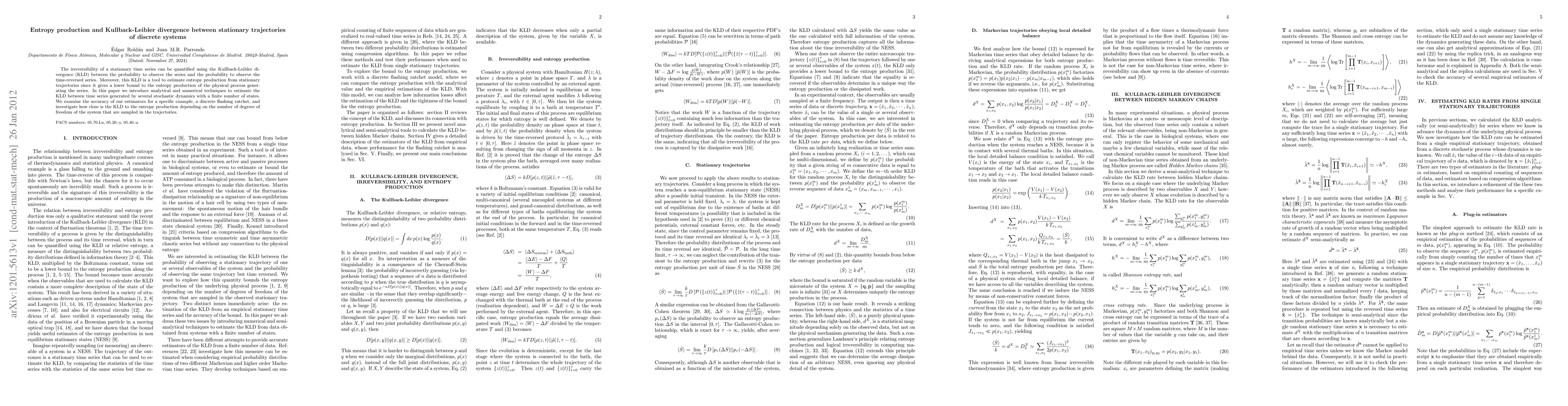 The irreversibility of a stationary time series can be quantified using the Kullback-Leibler divergence (KLD) between the probability to observe the series and the probability to observe the time-reversed series. Moreover, this KLD is a tool to estimate entropy production from stationary trajectories since it gives a lower bound to the entropy production of the physical process generating the series. In this paper we introduce analytical and numerical techniques to estimate the KLD between time series generated by several stochastic dynamics with a finite number of states. We examine the accuracy of our estimators for a specific example, a discrete flashing ratchet, and investigate how close is the KLD to the entropy production depending on the number of degrees of freedom of the system that are sampled in the trajectories.