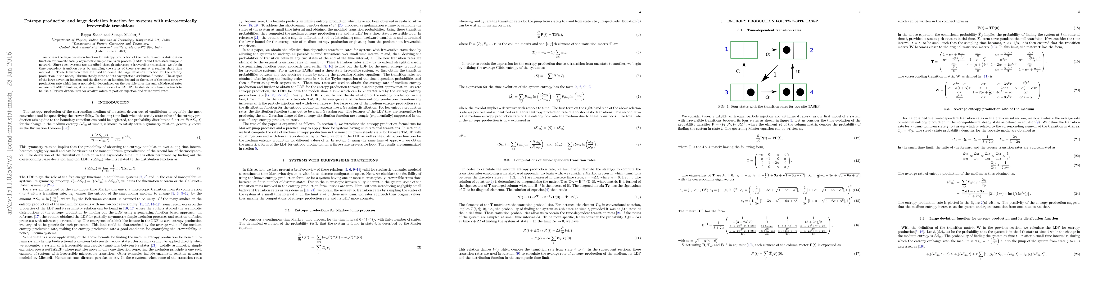 This paper derives the large deviation function for entropy production in systems with microscopically irreversible transitions, specifically for two-site TASEP and a three-state unicyclic network. The study reveals that the shapes of the large deviation and distribution functions depend on the mean entropy production rate, which is influenced by particle injection and withdrawal rates, with the distribution tending towards a Poisson form at lower rates.