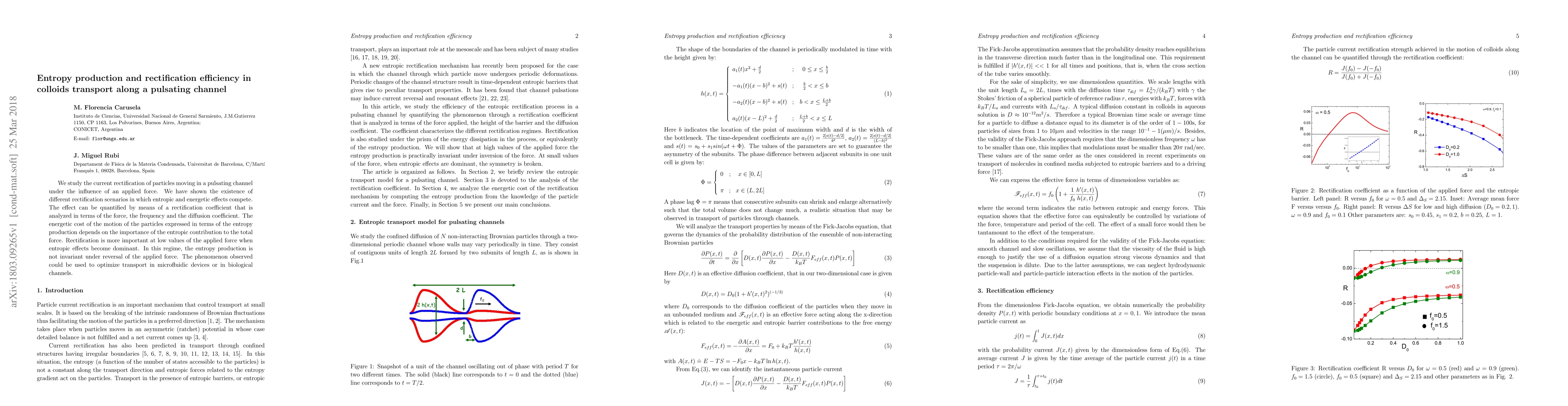 We study the current rectification of particles moving in a pulsating channel under the in uence of an applied force. We have shown the existence of diferent rectification scenarios in which entropic and energetic effects compete. The effect can be quantified by means of a rectification coefficient that is analyzed in terms of the force, the frequency and the diffusion coefficient. The energetic cost of the motion of the particles expressed in terms of the entropy production depends on the importance of the entropic contribution to the total force. Rectification is more important at low values of the applied force when entropic effects become dominant. In this regime, the entropy production is not invariant under reversal of the applied force. The phenomenon observed could be used to optimize transport in microfluidic devices or in biological channels.