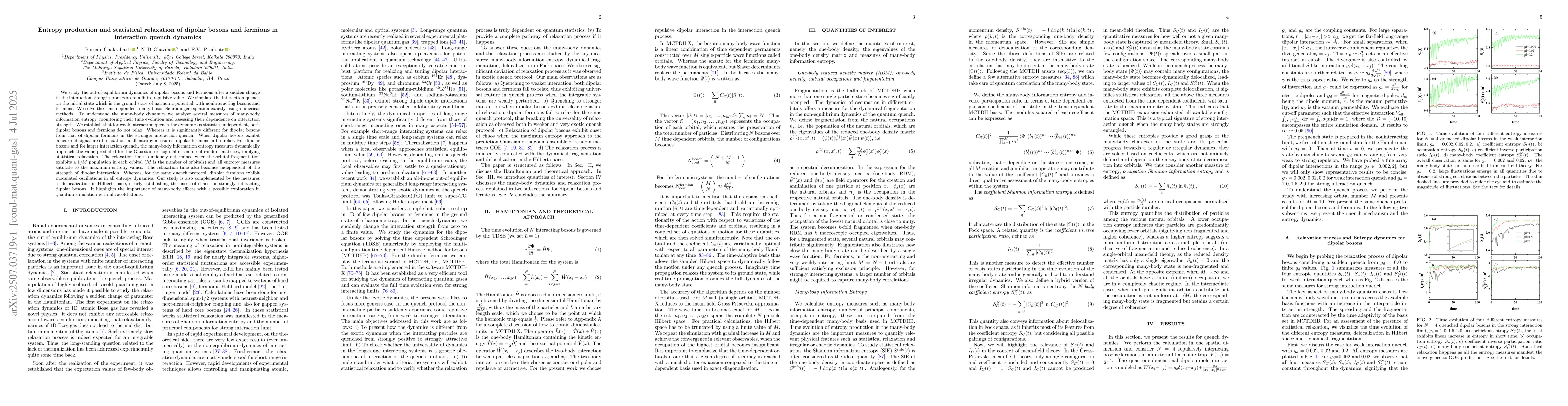 We study the out-of-equilibrium dynamics of dipolar bosons and fermions after a sudden change in the interaction strength from zero to a finite repulsive value. We simulate the interaction quench on the initial state which is the ground state of harmonic potential with noninteracting bosons and fermions. We solve the time-dependent many-boson Schr\"odinger equation exactly using numerical methods. To understand the many-body dynamics we analyze several measures of many-body information entropy, monitoring their time evolution and assessing their dependence on interaction strength. We establish that for weak interaction quench the dynamics is statistics independent, both dipolar bosons and fermions do not relax. Whereas it is significantly different for dipolar bosons from that of dipolar fermions in the stronger interaction quench. When dipolar bosons exhibit concurrent signature of relaxation in all entropy measures, dipolar fermions fail to relax. For dipolar bosons and for larger interaction quench, the many-body information entropy measures dynamically approach the value predicted for the Gaussian orthogonal ensemble of random matrices, implying statistical relaxation. The relaxation time is uniquely determined when the orbital fragmentation exhibits a $1/M$ population in each orbital ($M$ is the number of orbitals) and all entropy measures saturate to the maximum entropy values. The relaxation time also becomes independent of the strength of dipolar interaction. Whereas, for the same quench protocol, dipolar fermions exhibit modulated oscillations in all entropy dynamics. Our study is also complemented by the measures of delocalization in Hilbert space, clearly establishing the onset of chaos for strongly interacting dipolar bosons. It highlights the importance of many-body effects with a possible exploration in quantum simulation with ultracold atoms.