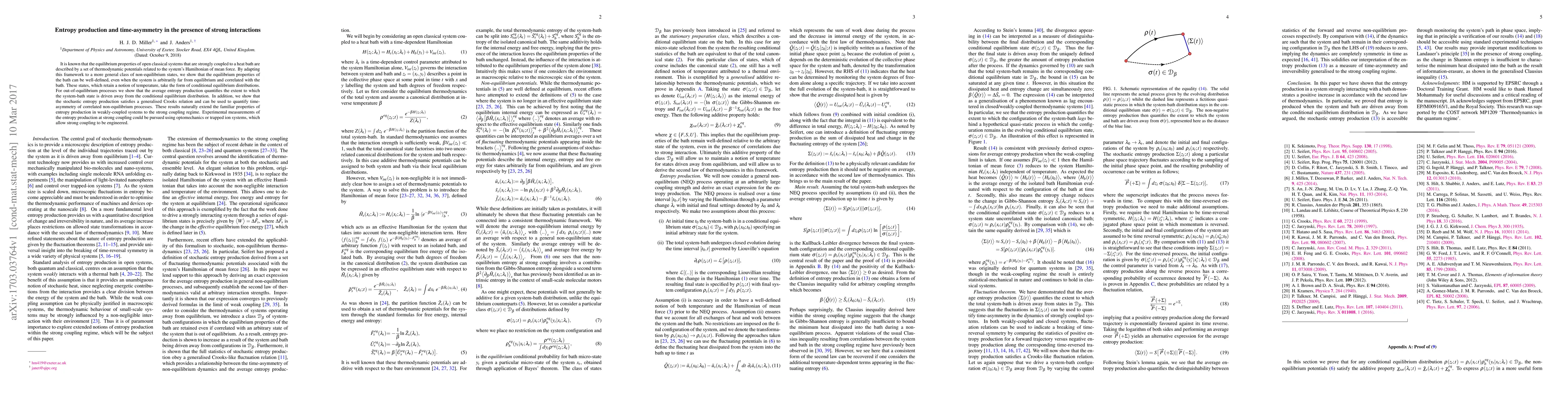 It is known that the equilibrium properties of open classical systems that are strongly coupled to a heat bath are described by a set of thermodynamic potentials related to the system's Hamiltonian of mean force. By adapting this framework to a more general class of non-equilibrium states, we show that the equilibrium properties of the bath can be well-defined, even when the system is arbitrarily far from equilibrium and correlated with the bath. These states, which retain a notion of temperature, take the form of conditional equilibrium distributions. For out-of-equilibrium processes we show that the average entropy production quantifies the extent to which the system-bath state is driven away from the conditional equilibrium distribution. In addition, we show that the stochastic entropy production satisfies a generalised Crooks relation and can be used to quantify time-asymmetry of correlated non-equilibrium processes. These results naturally extend the familiar properties of entropy production in weakly-coupled systems to the strong coupling regime. Experimental measurements of the entropy production at strong coupling could be pursued using optomechanics or trapped ion systems, which allow strong coupling to be engineered.