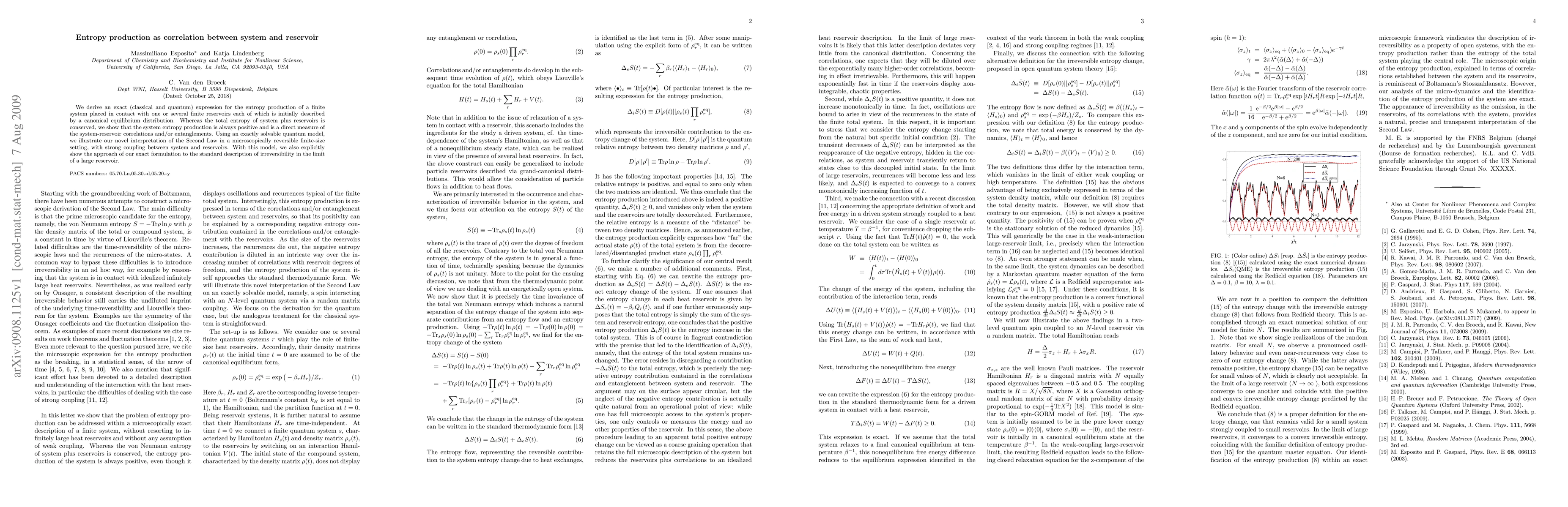 This paper derives an exact expression for entropy production in systems in contact with finite reservoirs, showing that it measures system-reservoir correlations and entanglements. It illustrates this with a quantum model, demonstrating how the exact formulation approaches standard irreversible descriptions in large reservoir limits.