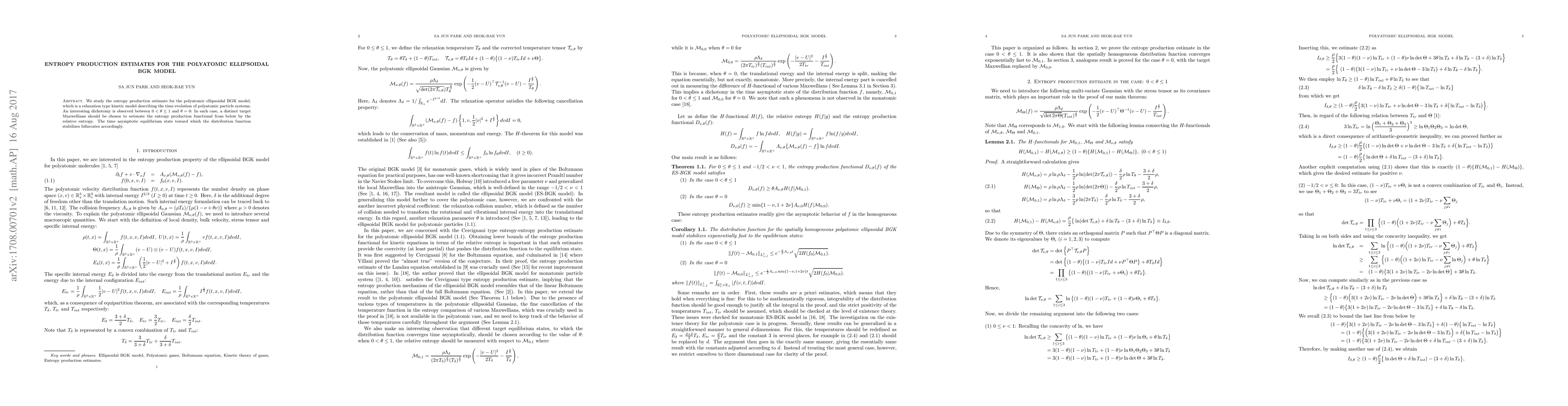 We study the entropy production estimate for the polyatomic ellipsoidal BGK model, which is a relaxation type kinetic model describing the time evolution of polyatomic particle systems. An interesting dichotomy is observed between $0<\theta\leq 1$ and $\theta=0$: In each case, a distinct target Maxwellians should be chosen to estimate the entropy production functional from below by the relative entropy. The time asymptotic equilibrium state toward which the distribution function stabilizes bifurcates accordingly.