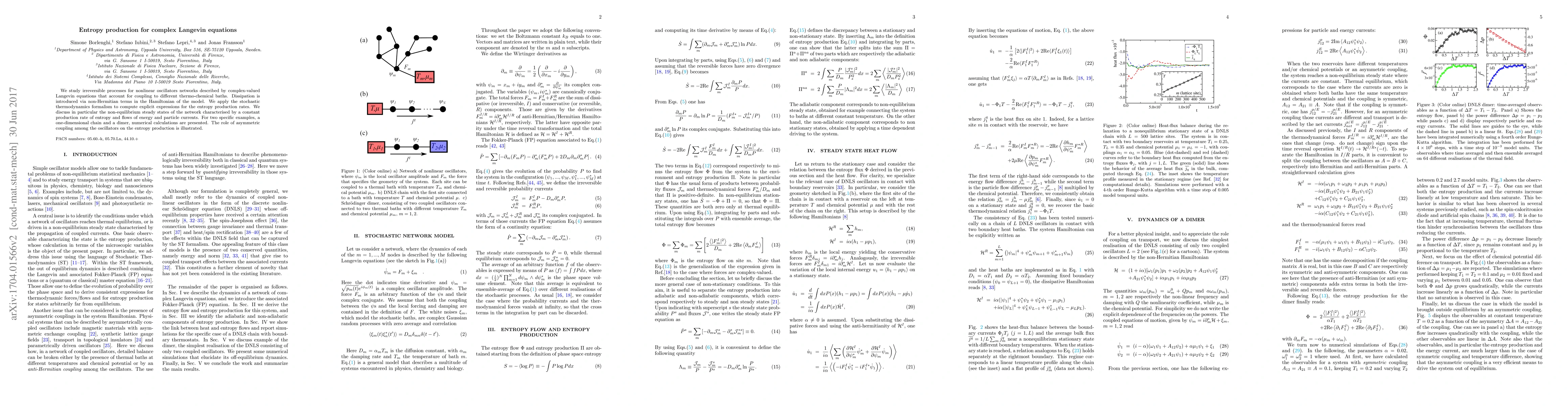 This paper investigates entropy production in nonlinear oscillator networks governed by complex-valued Langevin equations with non-Hermitian Hamiltonians, focusing on irreversible processes. It employs stochastic thermodynamics to derive expressions for entropy production rates, highlighting non-equilibrium steady states and the impact of asymmetric coupling on entropy production, with numerical examples for a one-dimensional chain and a dimer.
