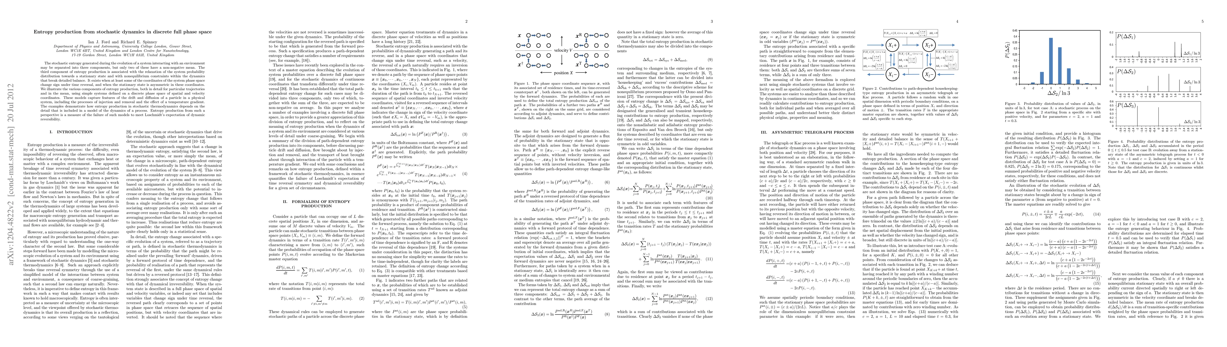 The stochastic entropy generated during the evolution of a system interacting with an environment may be separated into three components, but only two of these have a non-negative mean. The third component of entropy production is associated with the relaxation of the system probability distribution towards a stationary state and with nonequilibrium constraints within the dynamics that break detailed balance. It exists when at least some of the coordinates of the system phase space change sign under time reversal, and when the stationary state is asymmetric in these coordinates. We illustrate the various components of entropy production, both in detail for particular trajectories and in the mean, using simple systems defined on a discrete phase space of spatial and velocity coordinates. These models capture features of the drift and diffusion of a particle in a physical system, including the processes of injection and removal and the effect of a temperature gradient. The examples demonstrate how entropy production in stochastic thermodynamics depends on the detail that is included in a model of the dynamics of a process. Entropy production from such a perspective is a measure of the failure of such models to meet Loschmidt's expectation of dynamic reversibility.