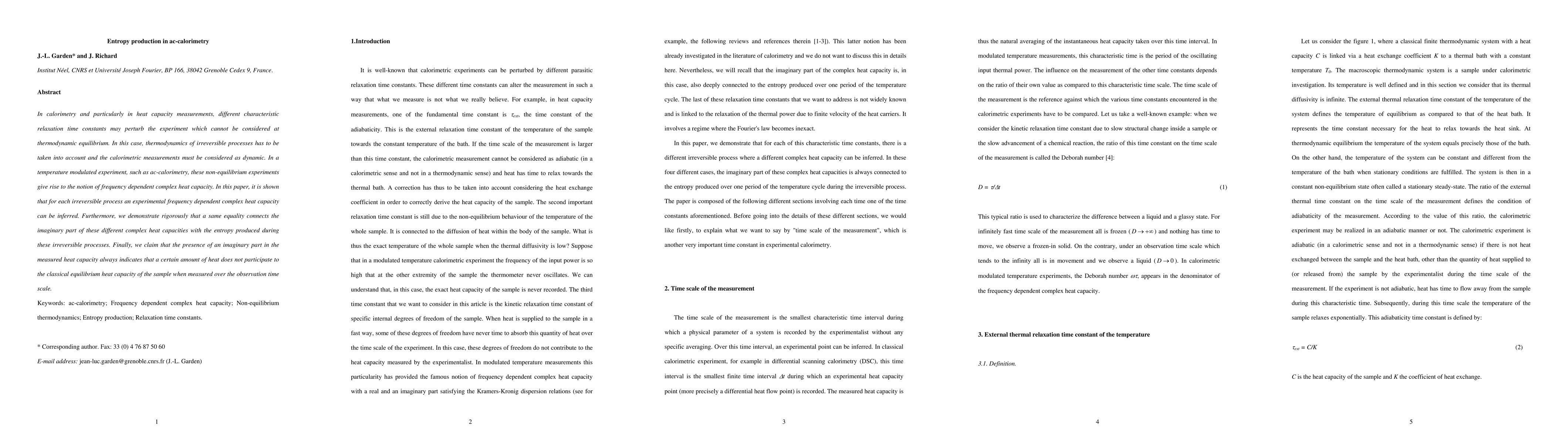 In calorimetry and particularly in heat capacity measurements, different characteristic relaxation time constants may perturb the experiment which cannot be considered at thermodynamic equilibrium. In this case, thermodynamics of irreversible processes has to be taken into account and the calorimetric measurements must be considered as dynamic. In a temperature modulated experiment, such as ac-calorimetry, these non-equilibrium experiments give rise to the notion of frequency dependent complex heat capacity. In this paper, it is shown that for each irreversible process an experimental frequency dependent complex heat capacity can be inferred. Furthermore, we demonstrate rigorously that a same equality connects the imaginary part of these different complex heat capacities with the entropy produced during these irreversible processes. Finally, we claim that the presence of an imaginary part in the measured heat capacity always indicates that a certain amount of heat does not participate to the classical equilibrium heat capacity of the sample when measured over the observation time scale.