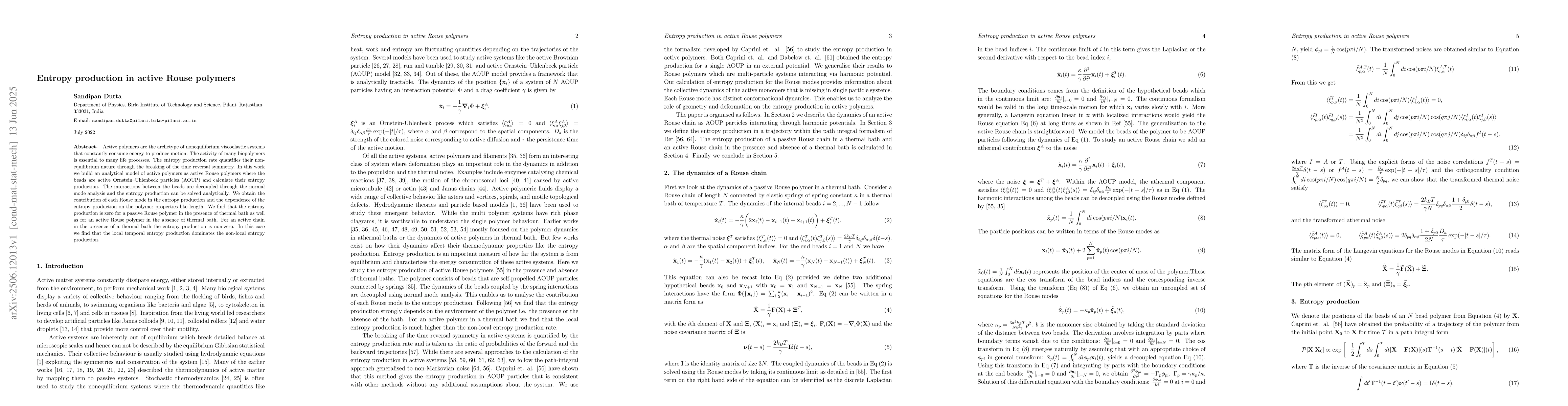 Active polymers are the archetype of nonequilibrium viscoelastic systems that constantly consume energy to produce motion. The activity of many biopolymers is essential to many life processes. The entropy production rate quantifies their nonequilibrium nature through the breaking of the time reversal symmetry. In this work we build an analytical model of active polymers as active Rouse polymers where the beads are active Ornstein Uhlenbeck particles and calculate their entropy production. The interactions between the beads are decoupled through the normal mode analysis and the entropy production can be solved analytically. We obtain the contribution of each Rouse mode in the entropy production and the dependence of the entropy production on the polymer properties like length. We find that the entropy production is zero for a passive Rouse polymer in the presence of thermal bath as well as for an active Rouse polymer in the absence of thermal bath. For an active chain in the presence of a thermal bath the entropy production is nonzero. In this case we find that the local temporal entropy production dominates the nonlocal entropy production.