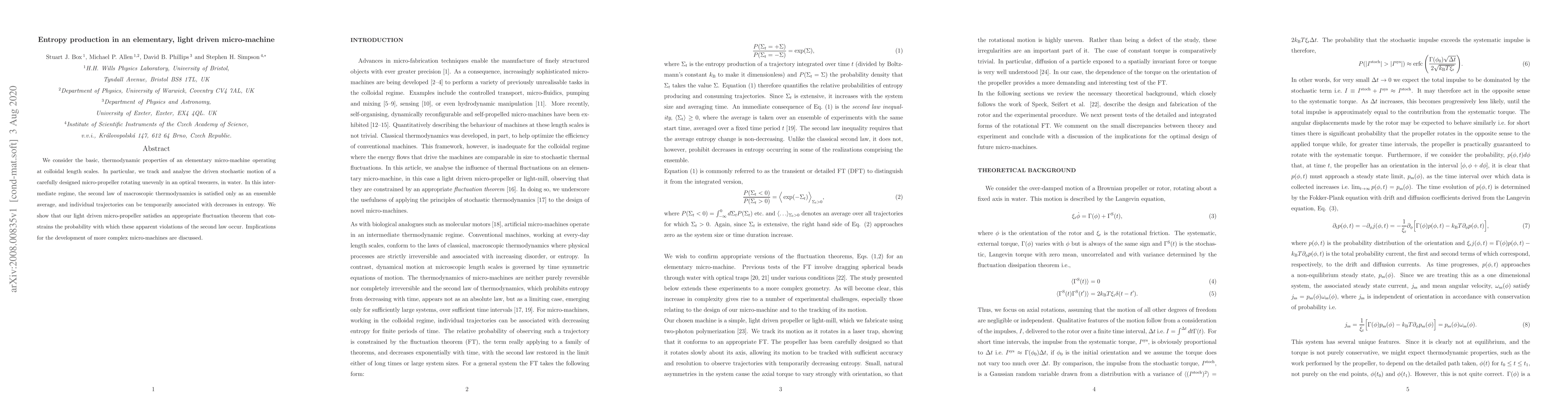 We consider the basic, thermodynamic properties of an elementary micro-machine operating at colloidal length scales. In particular, we track and analyse the driven stochastic motion of a carefully designed micro-propeller rotating unevenly in an optical tweezers, in water. In this intermediate regime, the second law of macroscopic thermodynamics is satisfied only as an ensemble average, and individual trajectories can be temporarily associated with decreases in entropy. We show that our light driven micro-propeller satisfies an appropriate fluctuation theorem that constrains the probability with which these apparent violations of the second law occur. Implications for the development of more complex micro-machines are discussed.