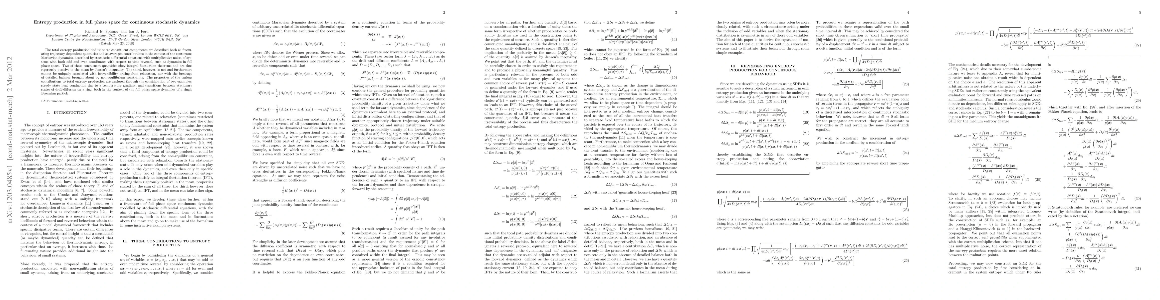 The total entropy production and its three constituent components are described both as fluctuating trajectory-dependent quantities and as averaged contributions in the context of the continuous Markovian dynamics, described by stochastic differential equations with multiplicative noise, of systems with both odd and even coordinates with respect to time reversal, such as dynamics in full phase space. Two of these constituent quantities obey integral fluctuation theorems and are thus rigorously positive in the mean by Jensen's inequality. The third, however, is not and furthermore cannot be uniquely associated with irreversibility arising from relaxation, nor with the breakage of detailed balance brought about by non-equilibrium constraints. The properties of the various contributions to total entropy production are explored through the consideration of two examples: steady state heat conduction due to a temperature gradient, and transitions between stationary states of drift-diffusion on a ring, both in the context of the full phase space dynamics of a single Brownian particle.