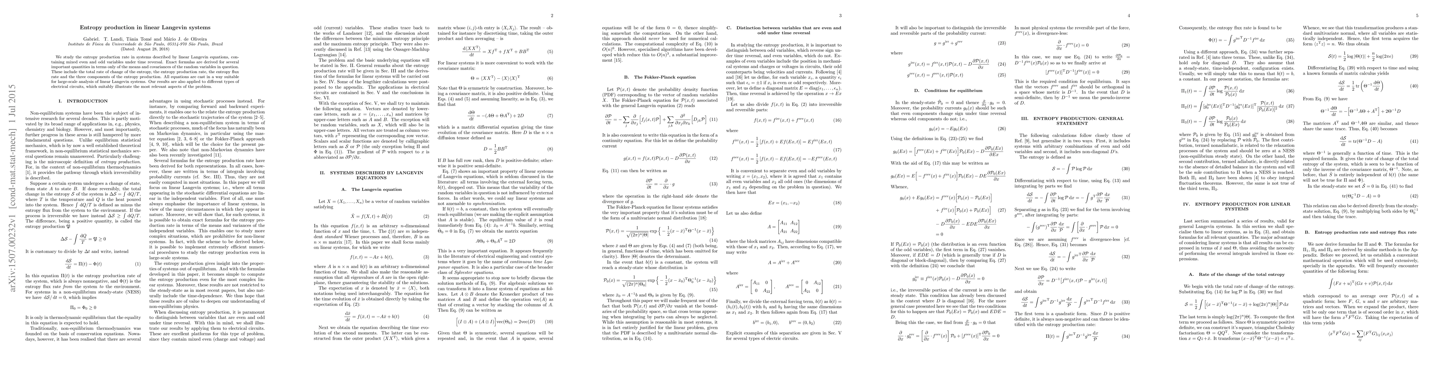 This paper derives exact formulas for the entropy production rate in linear Langevin systems, expressed solely in terms of the means and covariances of random variables. The study applies these results to electrical circuits to illustrate key concepts.