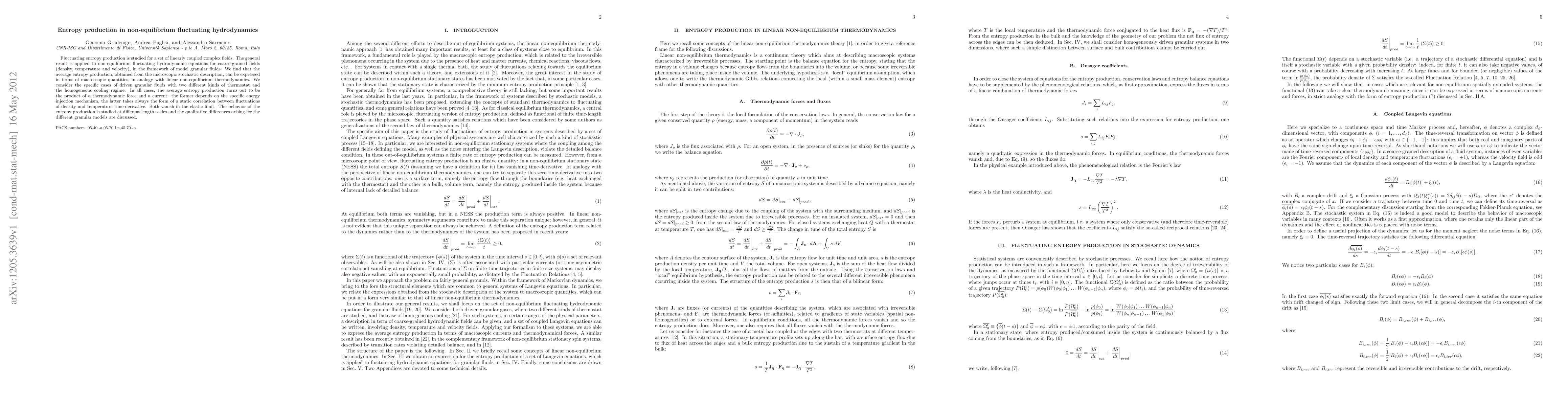This paper investigates fluctuating entropy production in non-equilibrium systems, applying the findings to granular fluids. It reveals that average entropy production can be expressed in terms of macroscopic quantities, analogous to linear non-equilibrium thermodynamics, and identifies specific mechanisms for entropy production in different granular models.