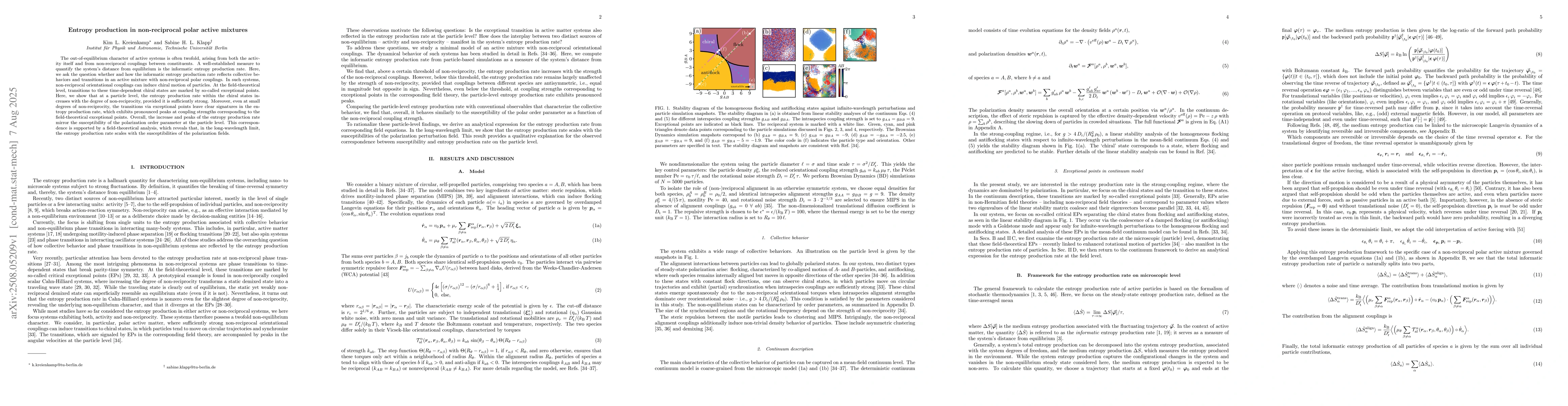 The out-of-equilibrium character of active systems is often twofold, arising from both the activity itself and from non-reciprocal couplings between constituents. A well-established measure to quantify the system's distance from equilibrium is the informatic entropy production rate. Here, we ask the question whether and how the informatic entropy production rate reflects collective behaviors and transitions in an active mixture with non-reciprocal polar couplings. In such systems, non-reciprocal orientational couplings can induce chiral motion of particles. At the field-theoretical level, transitions to these time-dependent chiral states are marked by so-called exceptional points. Here, we show that at a particle level, the entropy production rate within the chiral states increases with the degree of non-reciprocity, provided it is sufficiently strong. Moreover, even at small degrees of non-reciprocity, the transitions via exceptional points leave clear signatures in the entropy production rate, which exhibits pronounced peaks at coupling strengths corresponding to the field-theoretical exceptional points. Overall, the increase and peaks of the entropy production rate mirror the susceptibility of the polarization order parameter at the particle level. This correspondence is supported by a field-theoretical analysis, which reveals that, in the long-wavelength limit, the entropy production rate scales with the susceptibilities of the polarization fields.