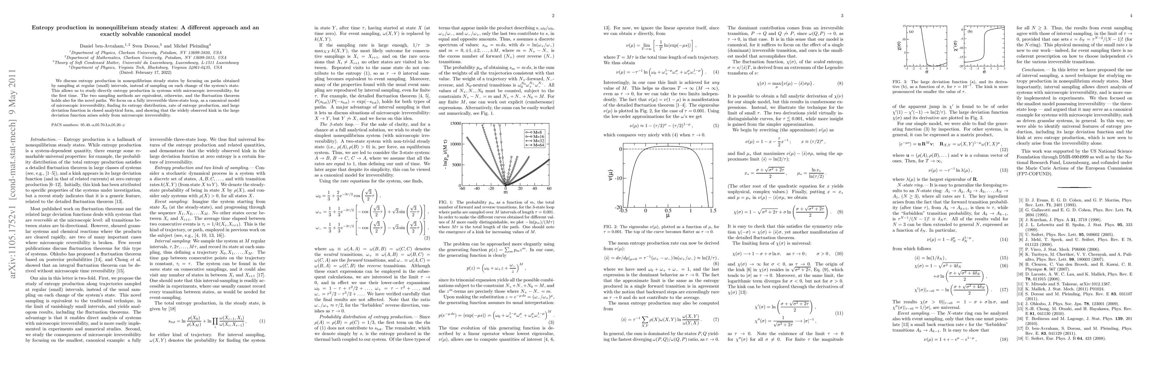 This paper explores entropy production in nonequilibrium steady states using a novel sampling approach that captures microscopic irreversibility directly. It analytically solves a three-state loop model, deriving the entropy distribution, rate of entropy production, and large deviation function, and identifies the kink in the large deviation function as a result of microscopic irreversibility.