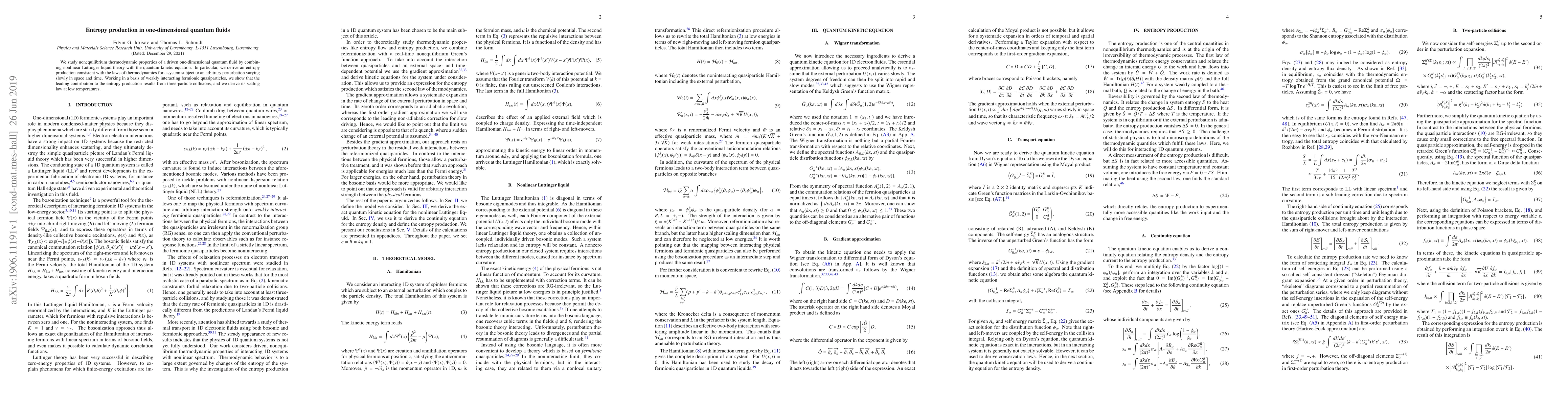 We study nonequilibrium thermodynamic properties of a driven one-dimensional quantum fluid by combining nonlinear Luttinger liquid theory with the quantum kinetic equation. In particular, we derive an entropy production consistent with the laws of thermodynamics for a system subject to an arbitrary perturbation varying slowly in space and time. Working in a basis of weakly interacting fermionic quasiparticles, we show that the leading contribution to the entropy production results from three-particle collisions, and we derive its scaling law at low temperatures.