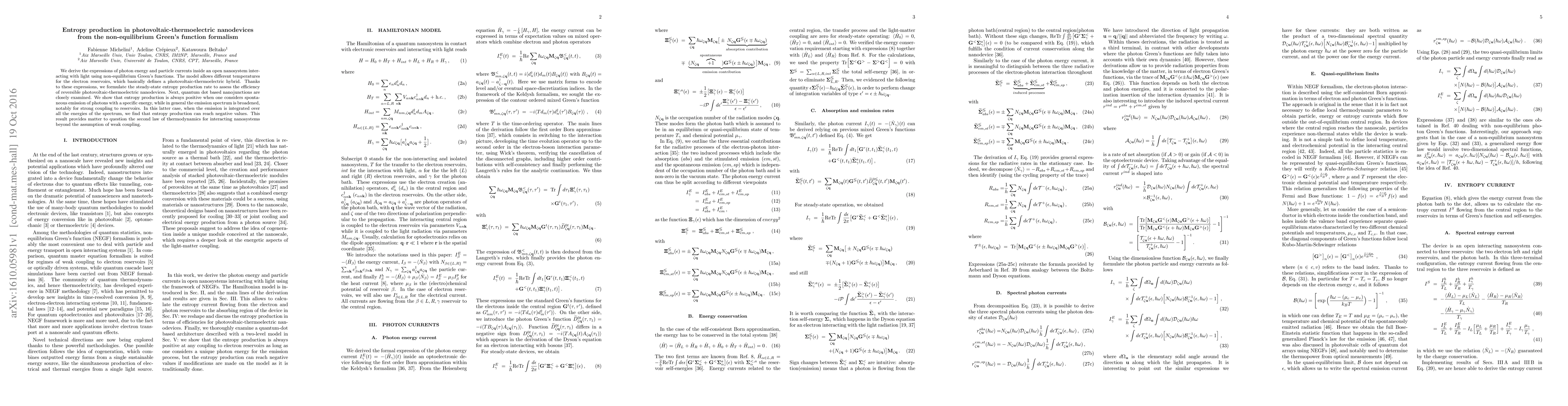 We derive the expressions of photon energy and particle currents inside an open nanosystem interacting with light using non-equilibrium Green's functions. The model allows different temperatures for the electron reservoirs, which basically defines a photovoltaic-thermoelectric hybrid. Thanks to these expressions, we formulate the steady-state entropy production rate to assess the efficiency of reversible photovoltaic-thermoelectric nanodevices. Next, quantum dot based nanojunctions are closely examined. We show that entropy production is always positive when one considers spontaneous emission of photons with a specific energy, while in general the emission spectrum is broadened, notably for strong coupling to reservoirs. In this latter case, when the emission is integrated over all the energies of the spectrum, we find that entropy production can reach negative values. This result provides matter to question the second law of thermodynamics for interacting nanosystems beyond the assumption of weak coupling.