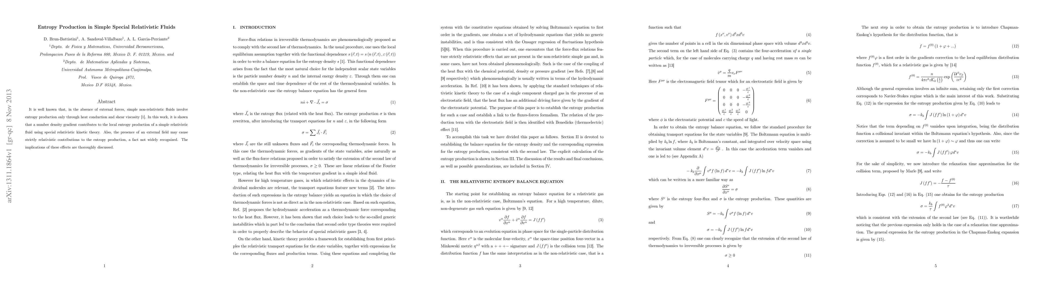 This paper demonstrates that simple relativistic fluids experience entropy production not only through heat conduction and shear viscosity but also via number density gradients, using special relativistic kinetic theory. Additionally, it highlights that external fields can induce strictly relativistic contributions to entropy production, a lesser-known effect.