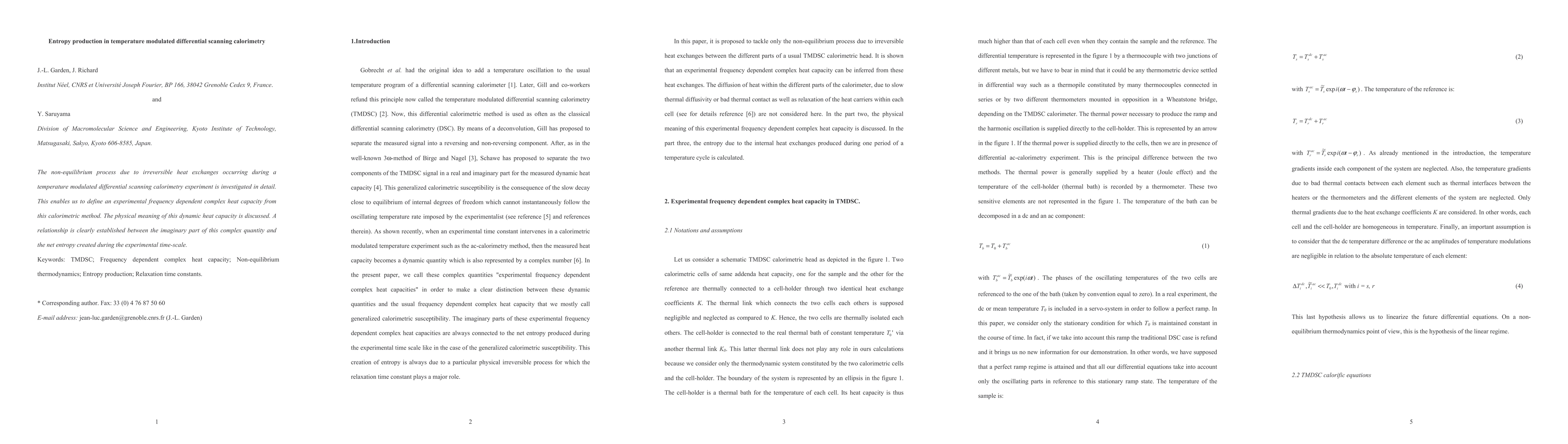 The non-equilibrium process due to irreversible heat exchanges occurring during a temperature modulated differential scanning calorimetry experiment is investigated in detail. This enables us to define an experimental frequency dependent complex heat capacity from this calorimetric method. The physical meaning of this dynamic heat capacity is discussed. A relationship is clearly established between the imaginary part of this complex quantity and the net entropy created during the experimental time-scale.