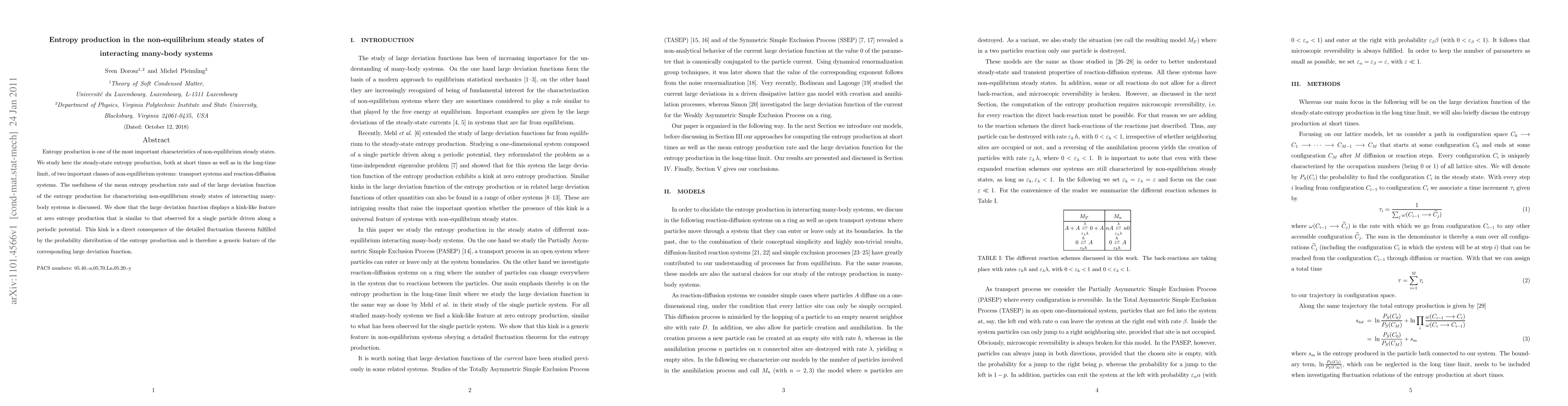 Entropy production is one of the most important characteristics of non-equilibrium steady states. We study here the steady-state entropy production, both at short times as well as in the long-time limit, of two important classes of non-equilibrium systems: transport systems and reaction-diffusion systems. The usefulness of the mean entropy production rate and of the large deviation function of the entropy production for characterizing non-equilibrium steady states of interacting many-body systems is discussed. We show that the large deviation function displays a kink-like feature at zero entropy production that is similar to that observed for a single particle driven along a periodic potential. This kink is a direct consequence of the detailed fluctuation theorem fulfilled by the probability distribution of the entropy production and is therefore a generic feature of the corresponding large deviation function.