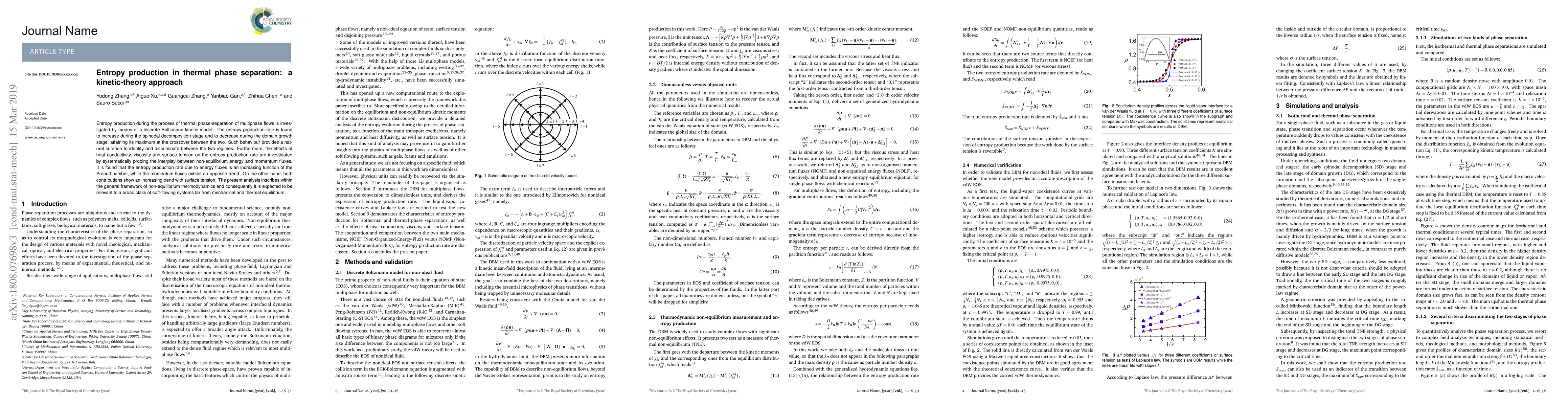 Researchers used a kinetic model to study entropy production in thermal phase separation of multiphase flows. They found that entropy production increases during spinodal decomposition and decreases during domain growth, with maximum production at the crossover point.