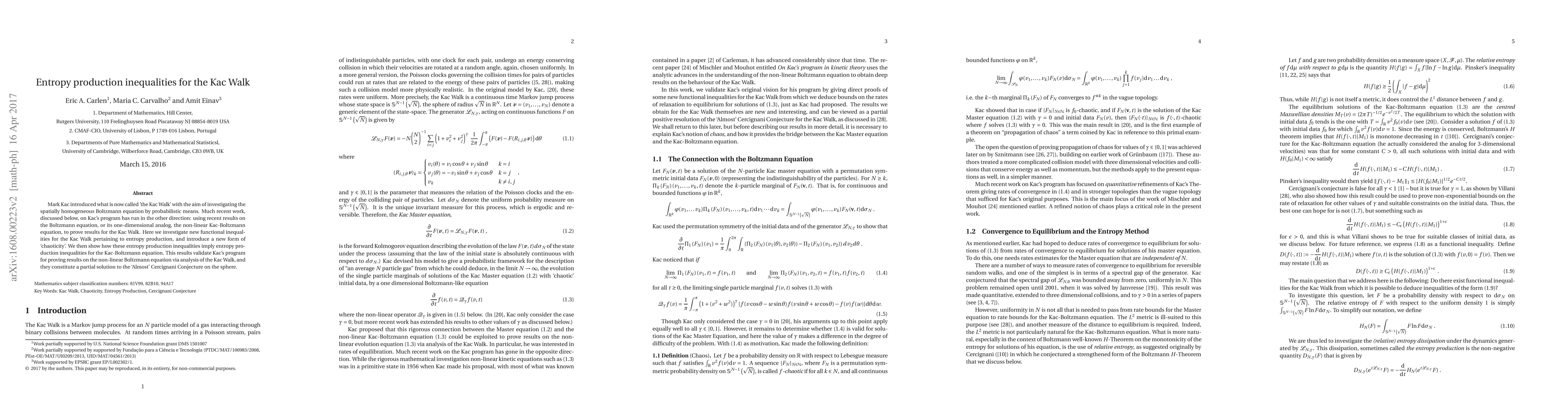 Mark Kac introduced what is now called 'the Kac Walk' with the aim of investigating the spatially homogeneous Boltzmann equation by probabilistic means. Much recent work, discussed below, on Kac's program has run in the other direction: using recent results on the Boltzmann equation, or its one-dimensional analog, the non-linear Kac-Boltzmann equation, to prove results for the Kac Walk. Here we investigate new functional inequalities for the Kac Walk pertaining to entropy production, and introduce a new form of `chaoticity'. We then show how these entropy production inequalities imply entropy production inequalities for the Kac-Boltzmann equation. This results validate Kac's program for proving results on the non-linear Boltzmann equation via analysis of the Kac Walk, and they constitute a partial solution to the `Almost' Cercignani Conjecture on the sphere.