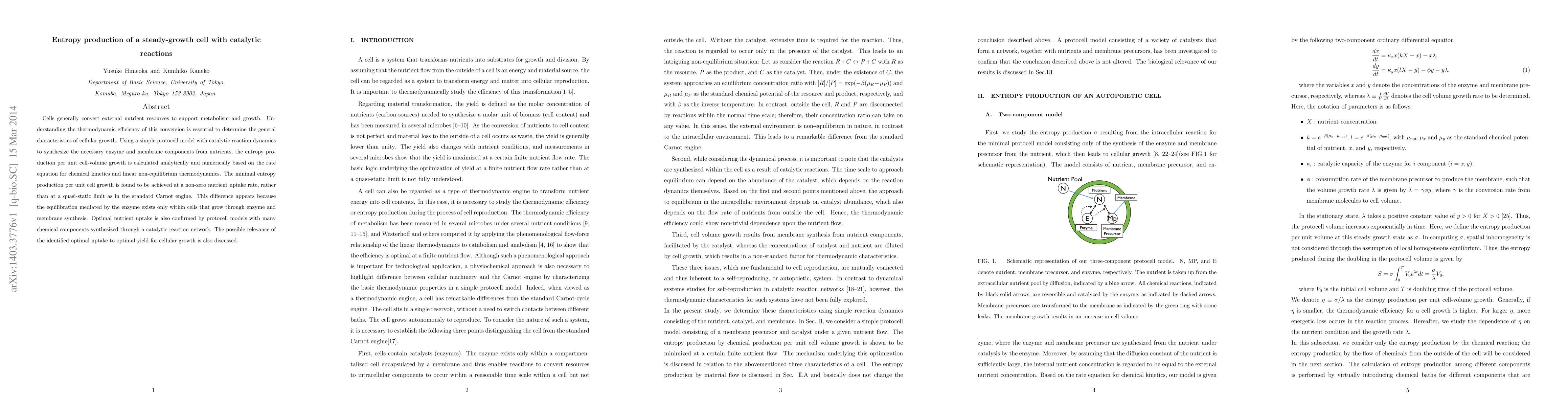 Cells generally convert external nutrient resources to support metabolismand growth. Understanding the thermodynamic efficiency of this conversion is essential to determine the general characteristics of cellular growth. Using a simple protocell model with catalytic reaction dynamics to synthesize the necessary enzyme and membrane components from nutrients, the entropy production per unit cell-volume growth is calculated analytically and numerically based on the rate equation for chemical kinetics and linear non-equilibrium thermodynamics. The minimal entropy production per unit cell growth is found to be achieved at a non-zero nutrient uptake rate, rather than at a quasi-static limit as in the standard Carnot engine. This difference appears because the equilibration mediated by the enzyme exists only within cells that grow through enzyme and membrane synthesis. Optimal nutrient uptake is also confirmed by protocell models with many chemical components synthesized through a catalytic reaction network. The possible relevance of the identified optimal uptake to optimal yield for cellular growth is also discussed.