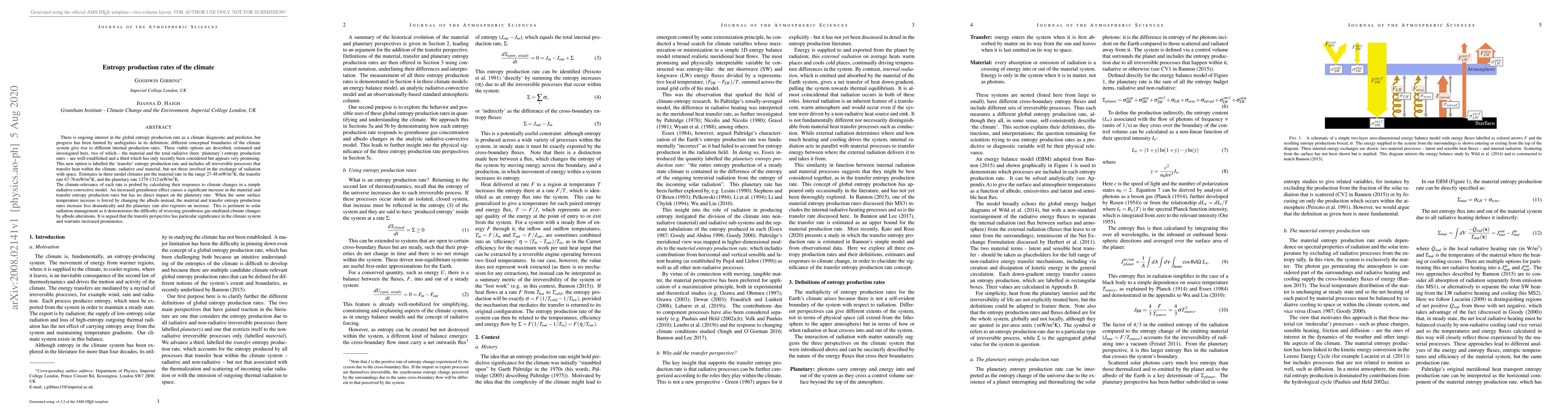 This paper explores different definitions of global entropy production rates in climate systems, estimating three rates: material, transfer, and planetary. It finds that while material and transfer rates respond significantly to greenhouse effects, the planetary rate does not, highlighting the transfer rate's potential importance in understanding climate dynamics.