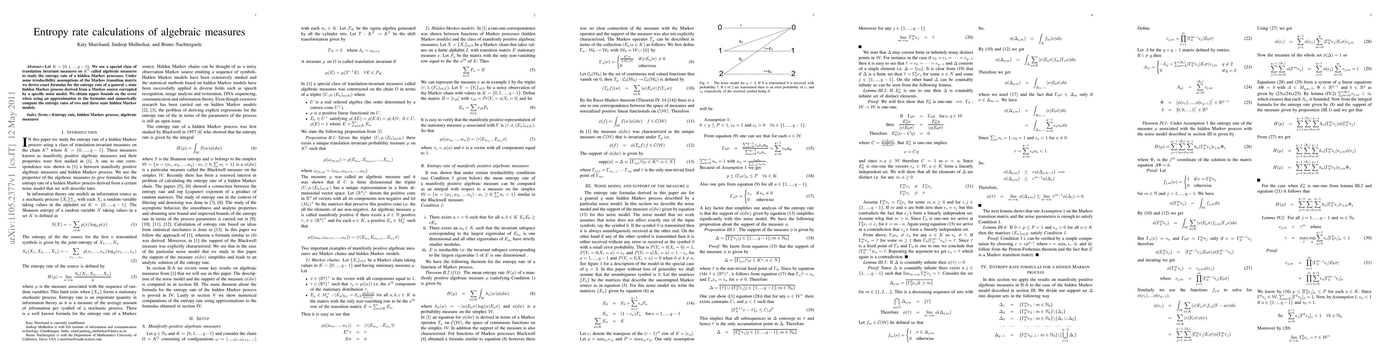 Let $K = \{0,1,...,q-1\}$. We use a special class of translation invariant measures on $K^\mathbb{Z}$ called algebraic measures to study the entropy rate of a hidden Markov processes. Under some irreducibility assumptions of the Markov transition matrix we derive exact formulas for the entropy rate of a general $q$ state hidden Markov process derived from a Markov source corrupted by a specific noise model. We obtain upper bounds on the error when using an approximation to the formulas and numerically compute the entropy rates of two and three state hidden Markov models.