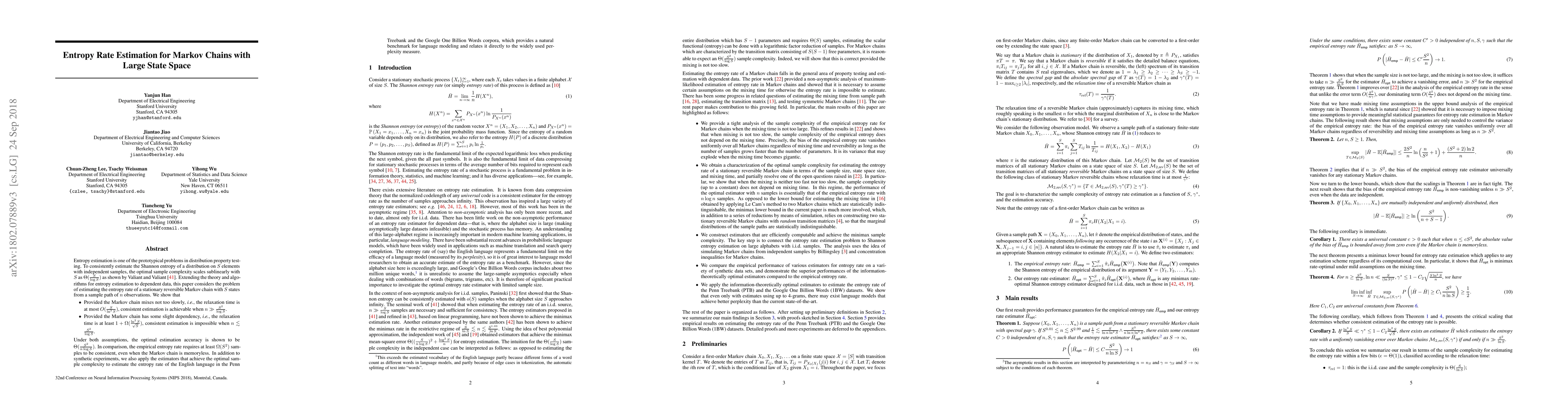 Estimating the entropy based on data is one of the prototypical problems in distribution property testing and estimation. For estimating the Shannon entropy of a distribution on $S$ elements with independent samples, [Paninski2004] showed that the sample complexity is sublinear in $S$, and [Valiant--Valiant2011] showed that consistent estimation of Shannon entropy is possible if and only if the sample size $n$ far exceeds $\frac{S}{\log S}$. In this paper we consider the problem of estimating the entropy rate of a stationary reversible Markov chain with $S$ states from a sample path of $n$ observations. We show that: (1) As long as the Markov chain mixes not too slowly, i.e., the relaxation time is at most $O(\frac{S}{\ln^3 S})$, consistent estimation is achievable when $n \gg \frac{S^2}{\log S}$. (2) As long as the Markov chain has some slight dependency, i.e., the relaxation time is at least $1+\Omega(\frac{\ln^2 S}{\sqrt{S}})$, consistent estimation is impossible when $n \lesssim \frac{S^2}{\log S}$. Under both assumptions, the optimal estimation accuracy is shown to be $\Theta(\frac{S^2}{n \log S})$. In comparison, the empirical entropy rate requires at least $\Omega(S^2)$ samples to be consistent, even when the Markov chain is memoryless. In addition to synthetic experiments, we also apply the estimators that achieve the optimal sample complexity to estimate the entropy rate of the English language in the Penn Treebank and the Google One Billion Words corpora, which provides a natural benchmark for language modeling and relates it directly to the widely used perplexity measure.