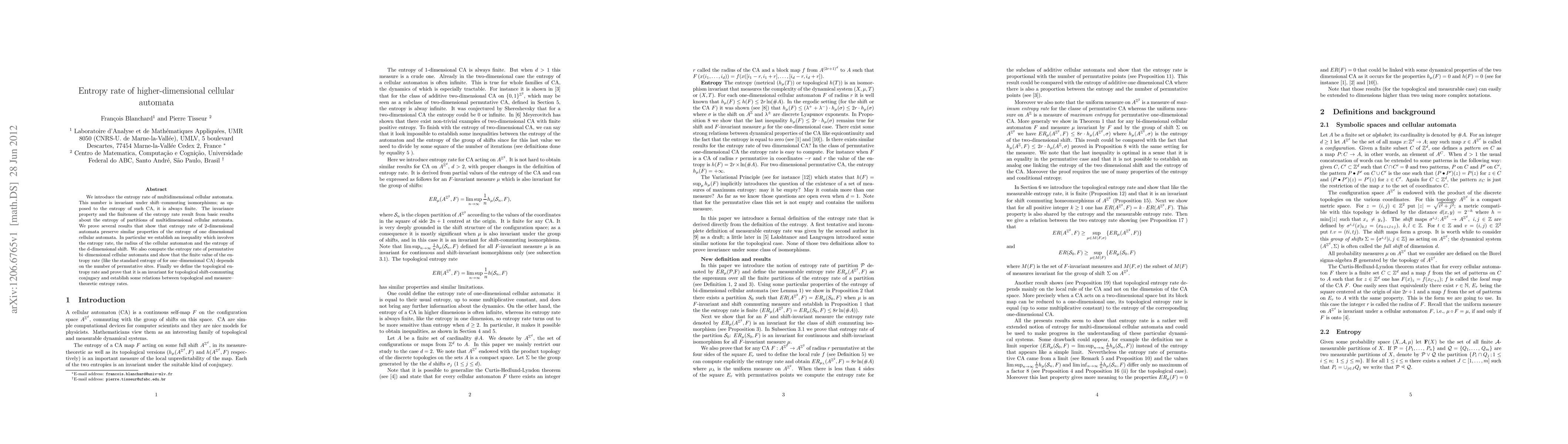 This paper introduces the entropy rate for multidimensional cellular automata, demonstrating its invariance under shift-commuting isomorphisms and finiteness. It establishes properties and inequalities for 2-dimensional automata, comparing them to one-dimensional CA, and computes the entropy rate for permutative bi-dimensional automata.