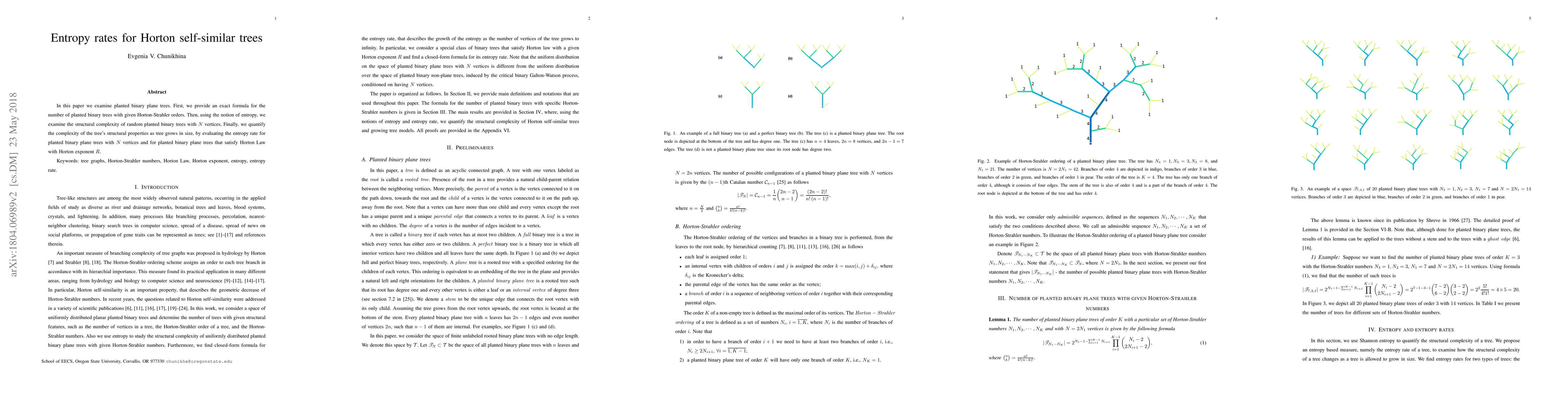 In this paper we examine planted binary plane trees. First, we provide an exact formula for the number of planted binary trees with given Horton-Strahler orders. Then, using the notion of entropy, we examine the structural complexity of random planted binary trees with N vertices. Finally, we quantify the complexity of the tree's structural properties as tree grows in size, by evaluating the entropy rate for planted binary plane trees with N vertices and for planted binary plane trees that satisfy Horton Law with Horton exponent R.