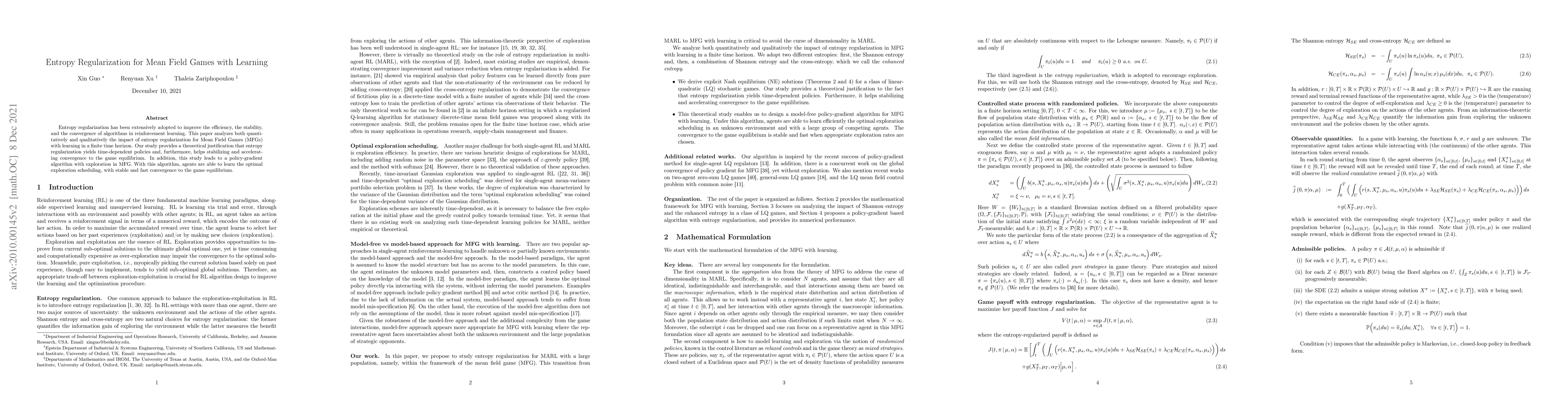 This paper investigates entropy regularization in Mean Field Games (MFG) with learning, demonstrating its role in stabilizing and accelerating convergence to equilibrium. It provides a theoretical foundation for time-dependent policies and introduces a policy-gradient algorithm for optimal exploration scheduling.