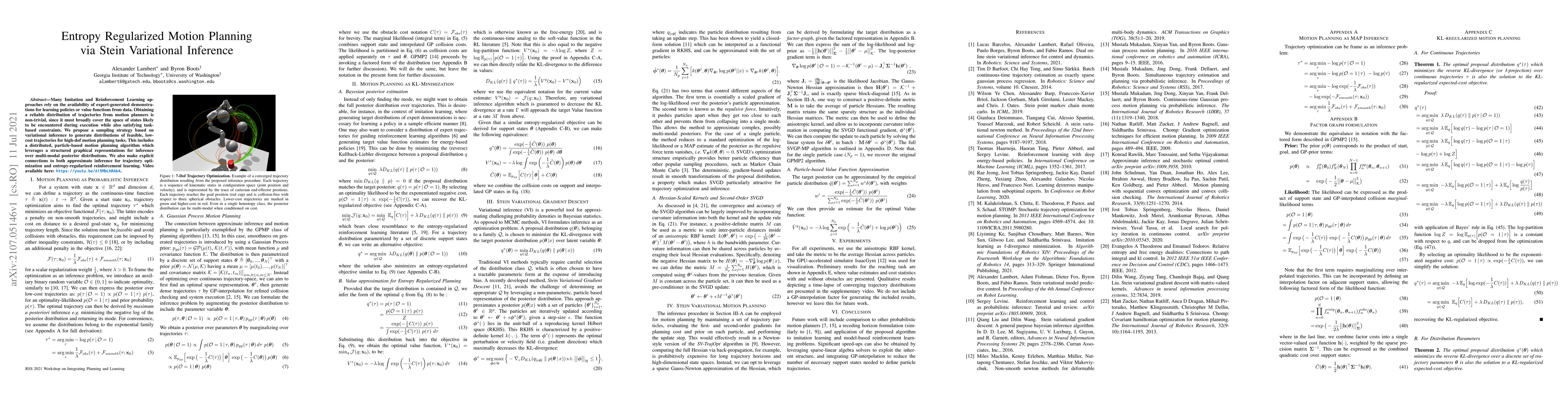 Many Imitation and Reinforcement Learning approaches rely on the availability of expert-generated demonstrations for learning policies or value functions from data. Obtaining a reliable distribution of trajectories from motion planners is non-trivial, since it must broadly cover the space of states likely to be encountered during execution while also satisfying task-based constraints. We propose a sampling strategy based on variational inference to generate distributions of feasible, low-cost trajectories for high-dof motion planning tasks. This includes a distributed, particle-based motion planning algorithm which leverages a structured graphical representations for inference over multi-modal posterior distributions. We also make explicit connections to both approximate inference for trajectory optimization and entropy-regularized reinforcement learning.