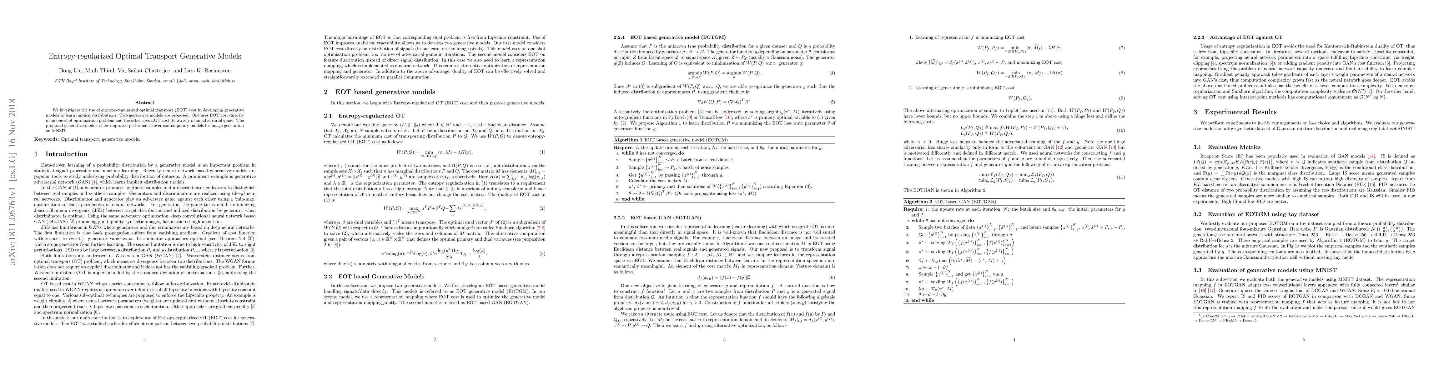 This paper explores entropy-regularized optimal transport (EOT) cost for developing generative models to implicitly learn data distributions. Two models are proposed: one optimizing EOT cost directly, and another using it iteratively in an adversarial game, both demonstrating superior performance for image generation on MNSIT compared to existing methods.