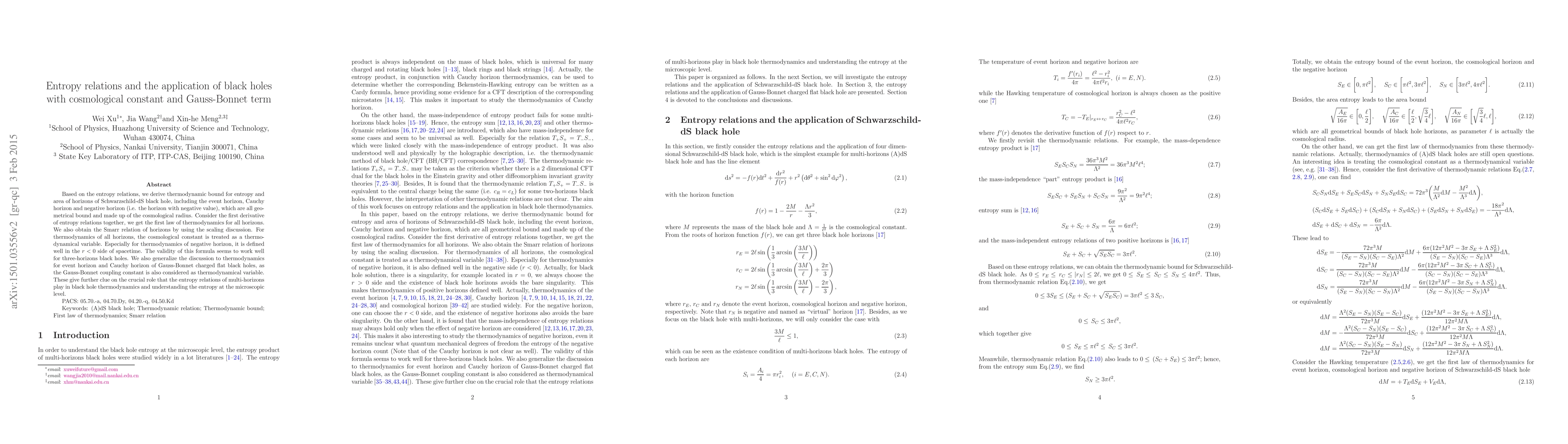 Based on the entropy relations, we derive thermodynamic bound for entropy and area of horizons of Schwarzschild-dS black hole, including the event horizon, Cauchy horizon and negative horizon (i.e. the horizon with negative value), which are all geometrical bound and made up of the cosmological radius. Consider the first derivative of entropy relations together, we get the first law of thermodynamics for all horizons. We also obtain the Smarr relation of horizons by using the scaling discussion. For thermodynamics of all horizons, the cosmological constant is treated as a thermodynamical variable. Especially for thermodynamics of negative horizon, it is defined well in the $r<0$ side of spacetime. The validity of this formula seems to work well for three-horizons black holes. We also generalize the discussion to thermodynamics for event horizon and Cauchy horizon of Gauss-Bonnet charged flat black holes, as the Gauss-Bonnet coupling constant is also considered as thermodynamical variable. These give further clue on the crucial role that the entropy relations of multi-horizons play in black hole thermodynamics and understanding the entropy at the microscopic level.