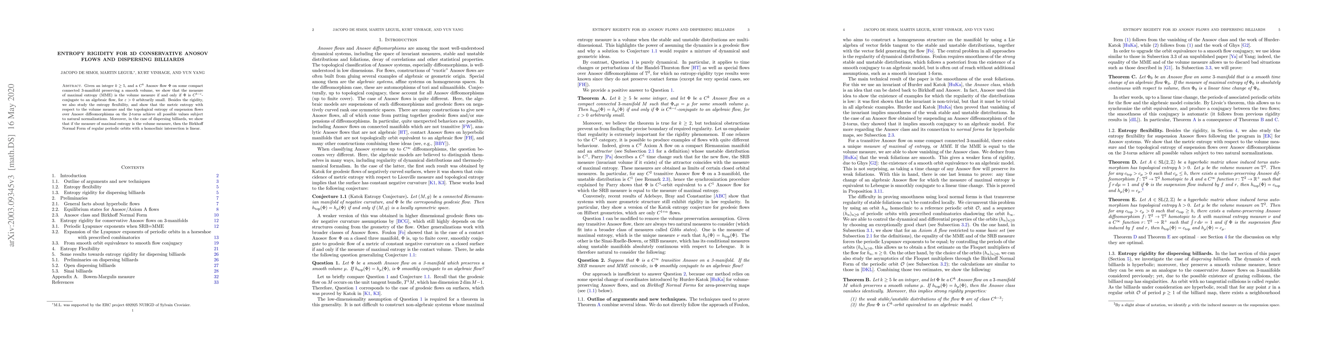 This paper demonstrates the rigidity of entropy for 3D conservative Anosov flows, proving that the measure of maximal entropy is the volume measure if the flow is conjugate to an algebraic flow. It also explores entropy flexibility, showing that the metric entropy and topological entropy of suspension flows over 2D torus diffeomorphisms can achieve all possible values under certain conditions, and reveals a linear Birkhoff Normal Form for dispersing billiards.