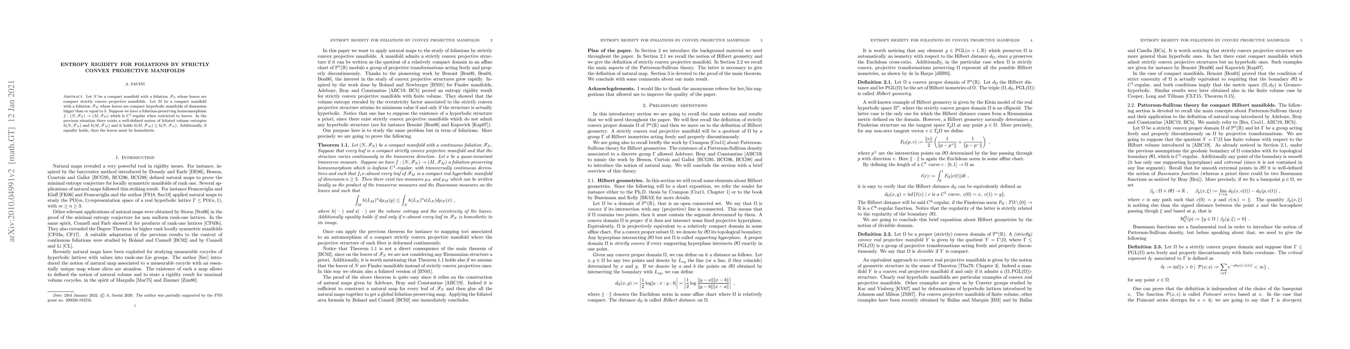 This paper explores entropy rigidity for foliations where the leaves of one foliation are strictly convex projective manifolds, and the other leaves are hyperbolic manifolds. It establishes that if a foliation-preserving homeomorphism exists between these foliations, then the foliated volume entropy of the first is greater than or equal to that of the second, with equality implying the leaves are homothetic.
