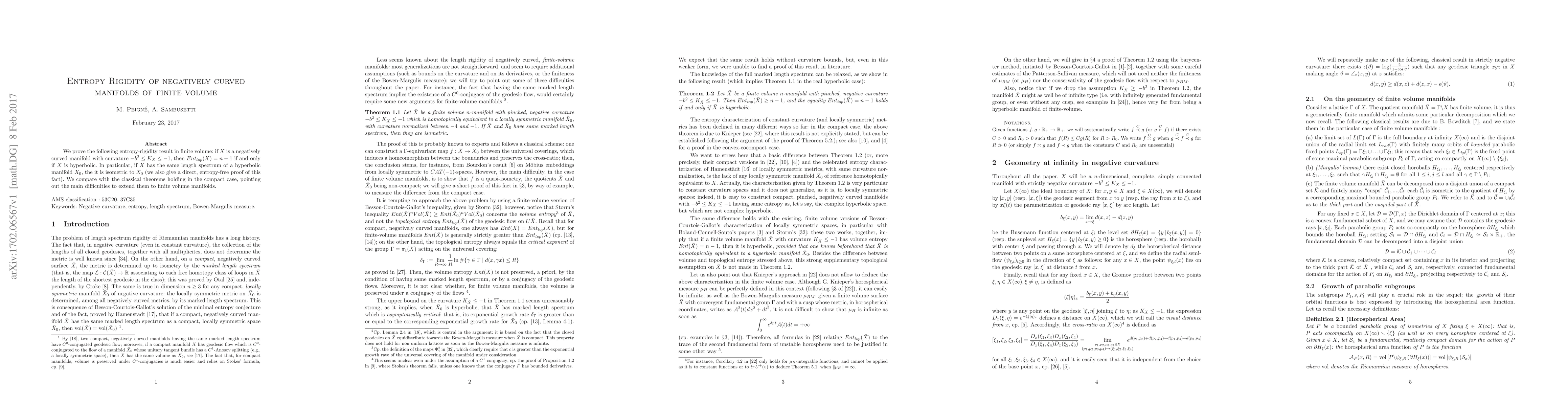 This paper proves entropy rigidity for negatively curved manifolds of finite volume, showing that if the curvature lies between $-b^2$ and $-1$, then the topological entropy equals $n-1$ if and only if the manifold is hyperbolic. It also establishes that manifolds with the same length spectrum as a hyperbolic manifold are isometric to it.