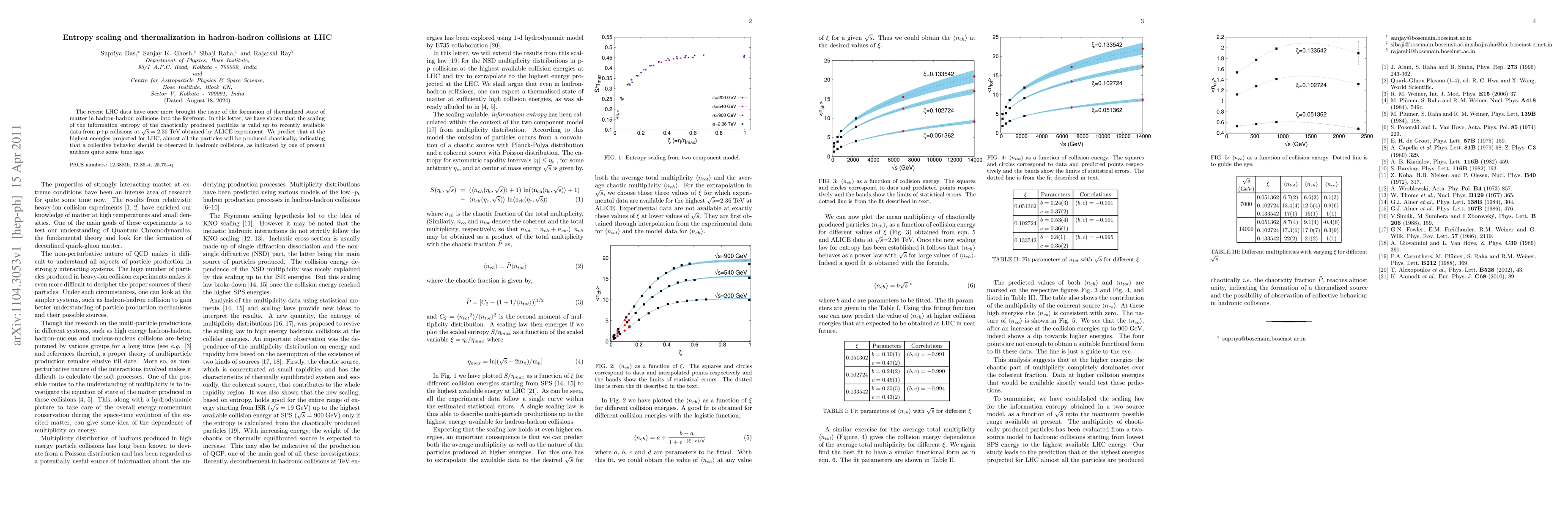 The recent LHC data have once more brought the issue of the formation of thermalized state of matter in hadron-hadron collisions into the forefront. In this letter, we have shown that the scaling of the information entropy of the chaotically produced particles is valid up to recently available data from p+p collisions at $\sqrt{s}$ = 2.36 TeV obtained by ALICE experiment. We predict that at the highest energies projected for LHC, almost all the particles will be produced chaotically, indicating that a collective behavior should be observed in hadronic collisions, as indicated by one of present authors quite some time ago.