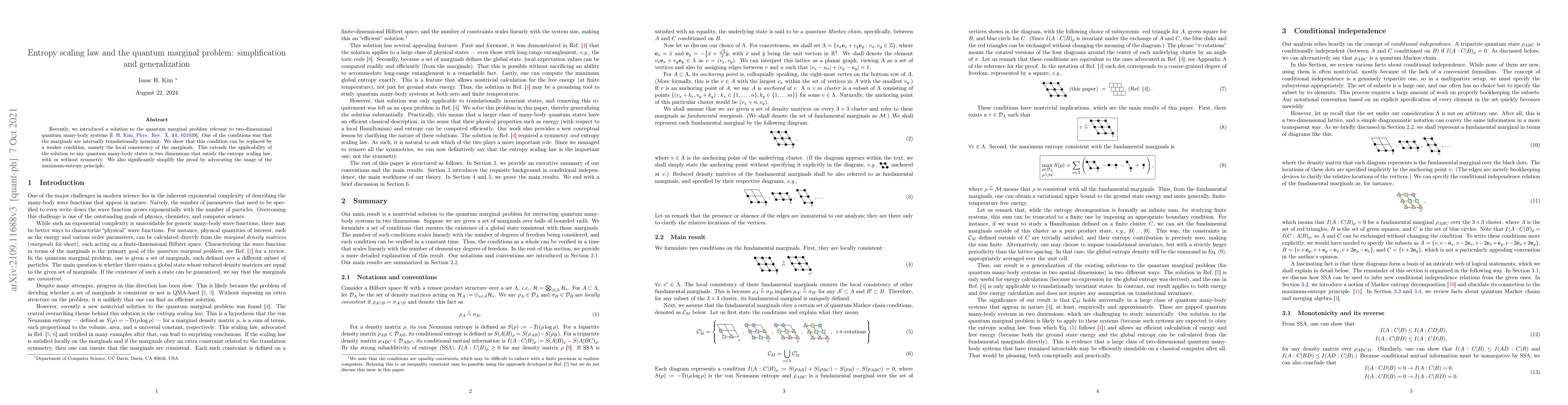 Recently, we introduced a solution to the quantum marginal problem relevant to two-dimensional quantum many-body systems [I. H. Kim, Phys. Rev. X, 11, 021039]. One of the conditions was that the marginals are internally translationally invariant. We show that this condition can be replaced by a weaker condition, namely the local consistency of the marginals. This extends the applicability of the solution to any quantum many-body states in two dimensions that satisfy the entropy scaling law, with or without symmetry. We also significantly simplify the proof by advocating the usage of the maximum-entropy principle.